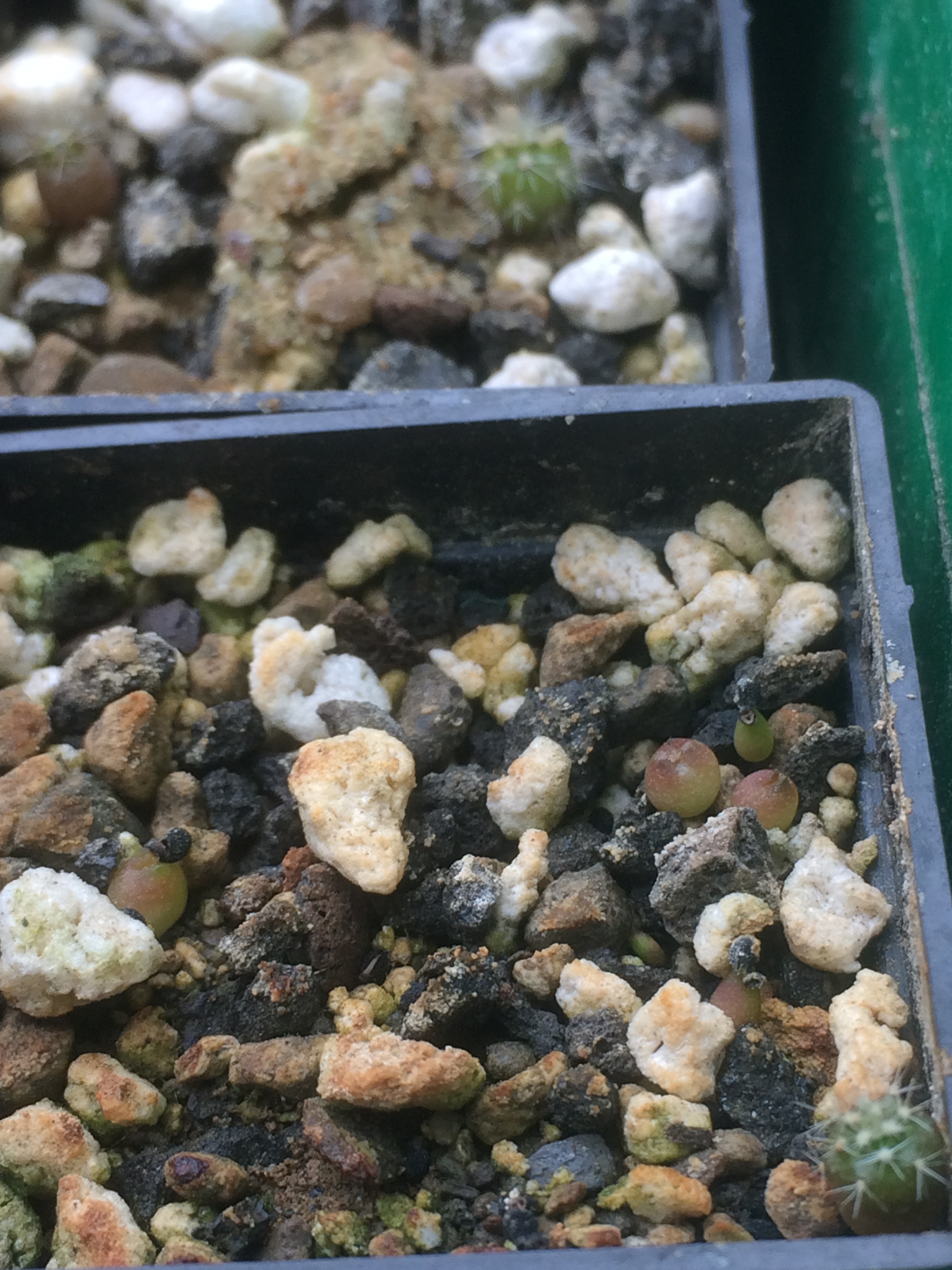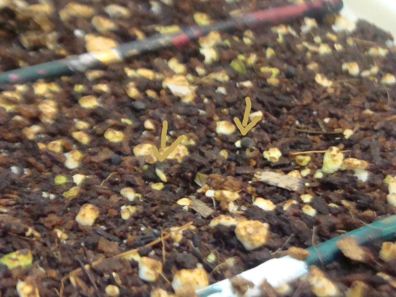 bei mir sind 2 Leuchtenbergia angefangen zu keimen siehe Bild mit Pfeilen.