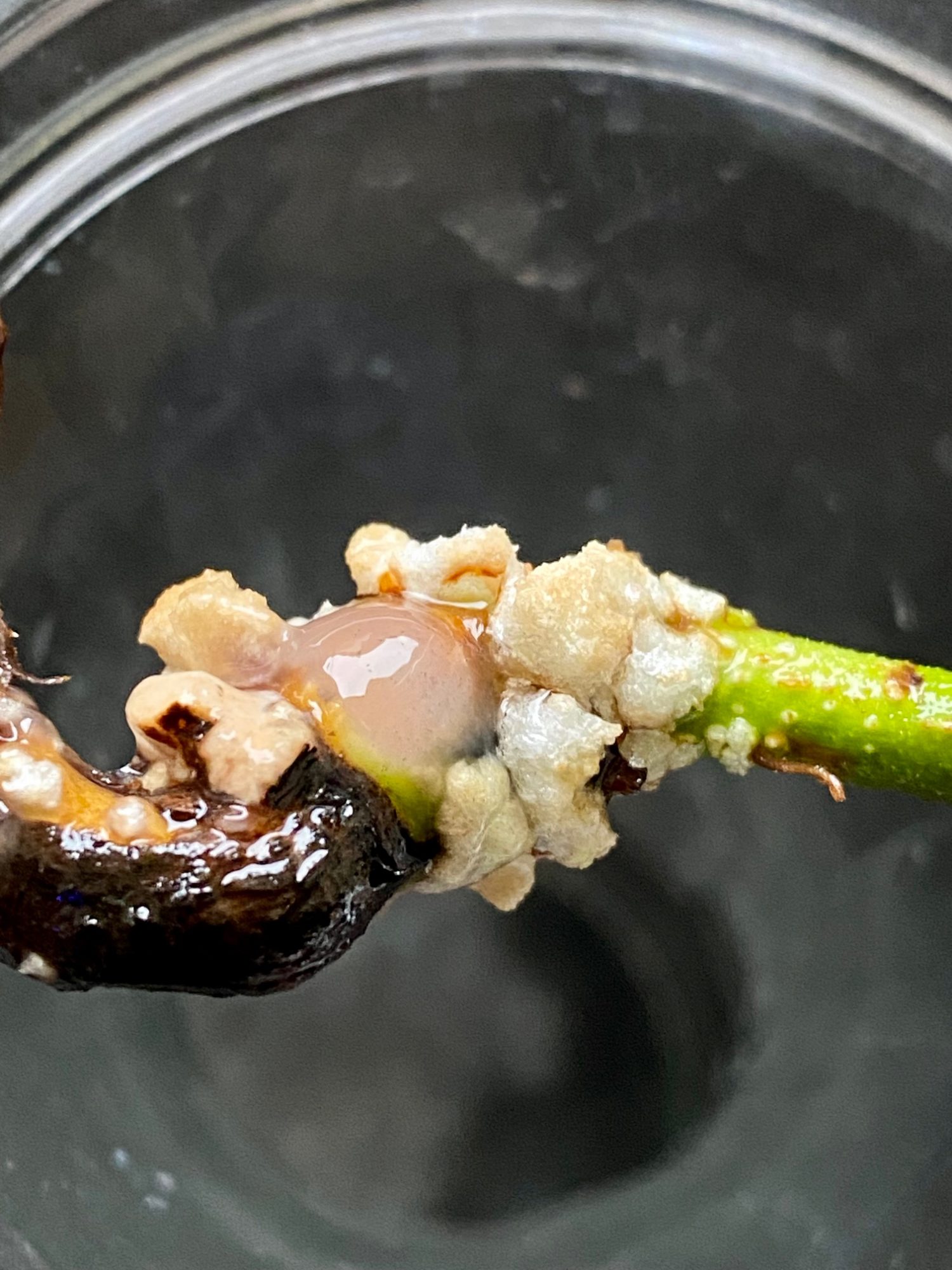 Also alles faulige weggeschnitten und ins Wasser gestellt. Die Blätter haben sich zwar wieder aufgerichtet, aber an der Wurzel bilden sich jetzt weisse Wucherungen und so ein glibberiges Ding.