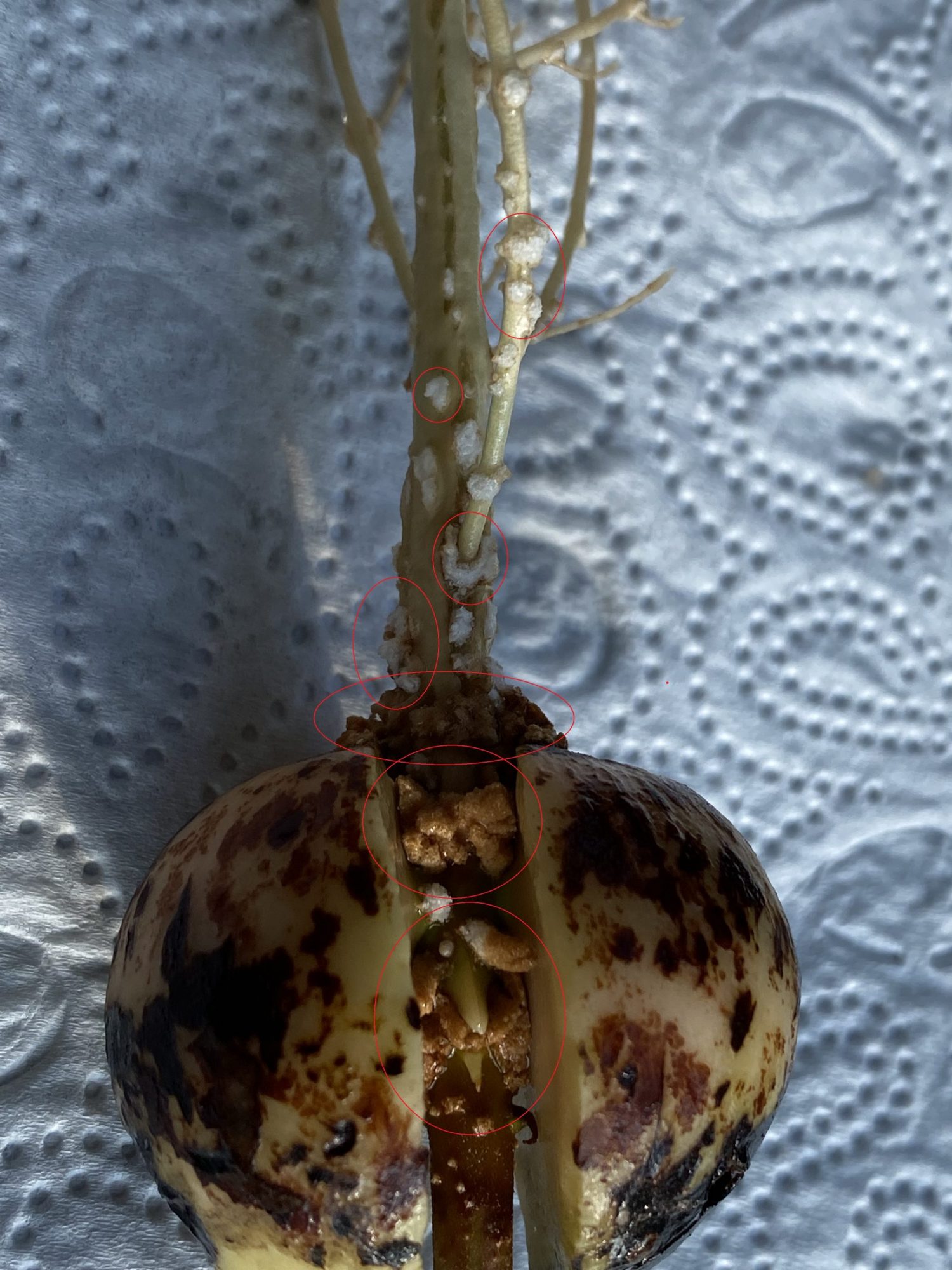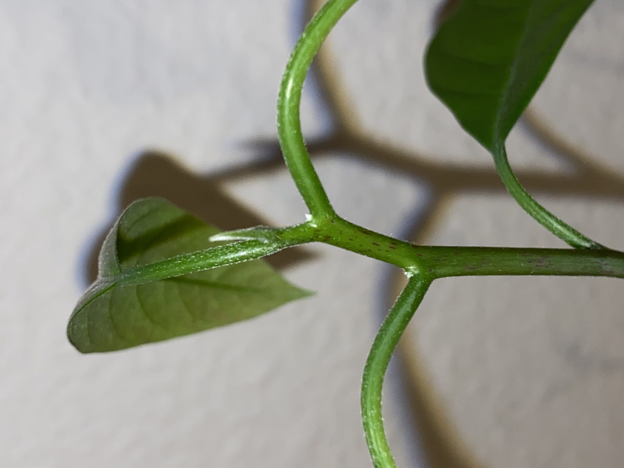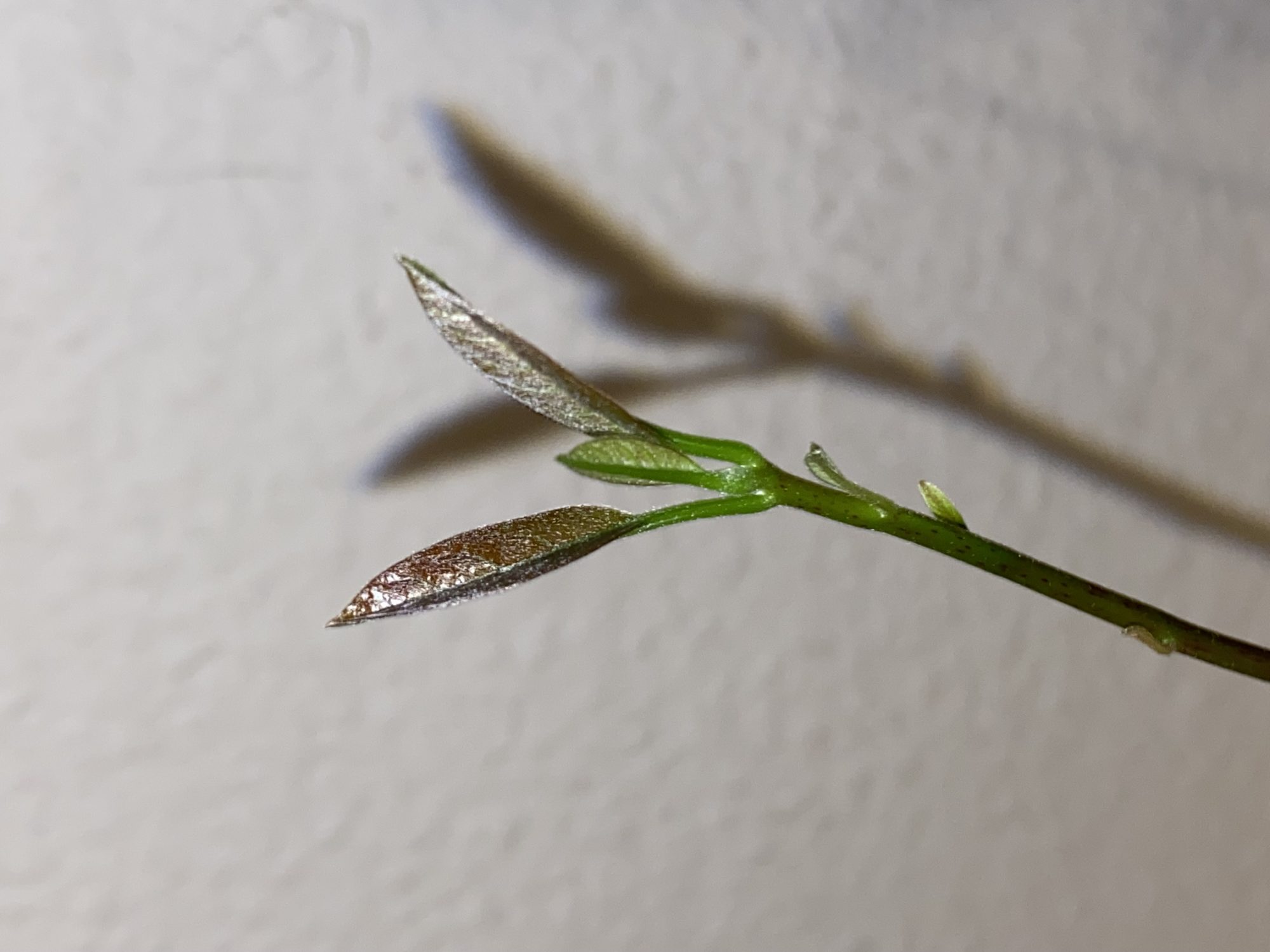 Beide haben unten/mittig jeweils einzelne Blattansätze, die jedoch vertrocknet oder bald vertrocknen und wohl bald abfallen (ca. 0,5mm dick x 4mm lang). Laut "Recherchen" soll man dem "langen Stiel" Abhilfe schaffen, indem man sie nach vier ausgewachsenen Blättern schneidet, damit sie unten neu austreibt.