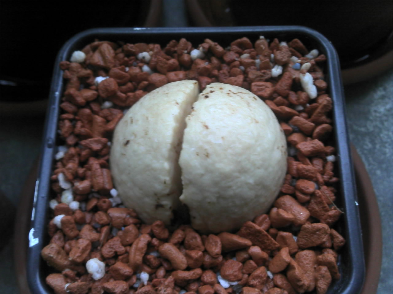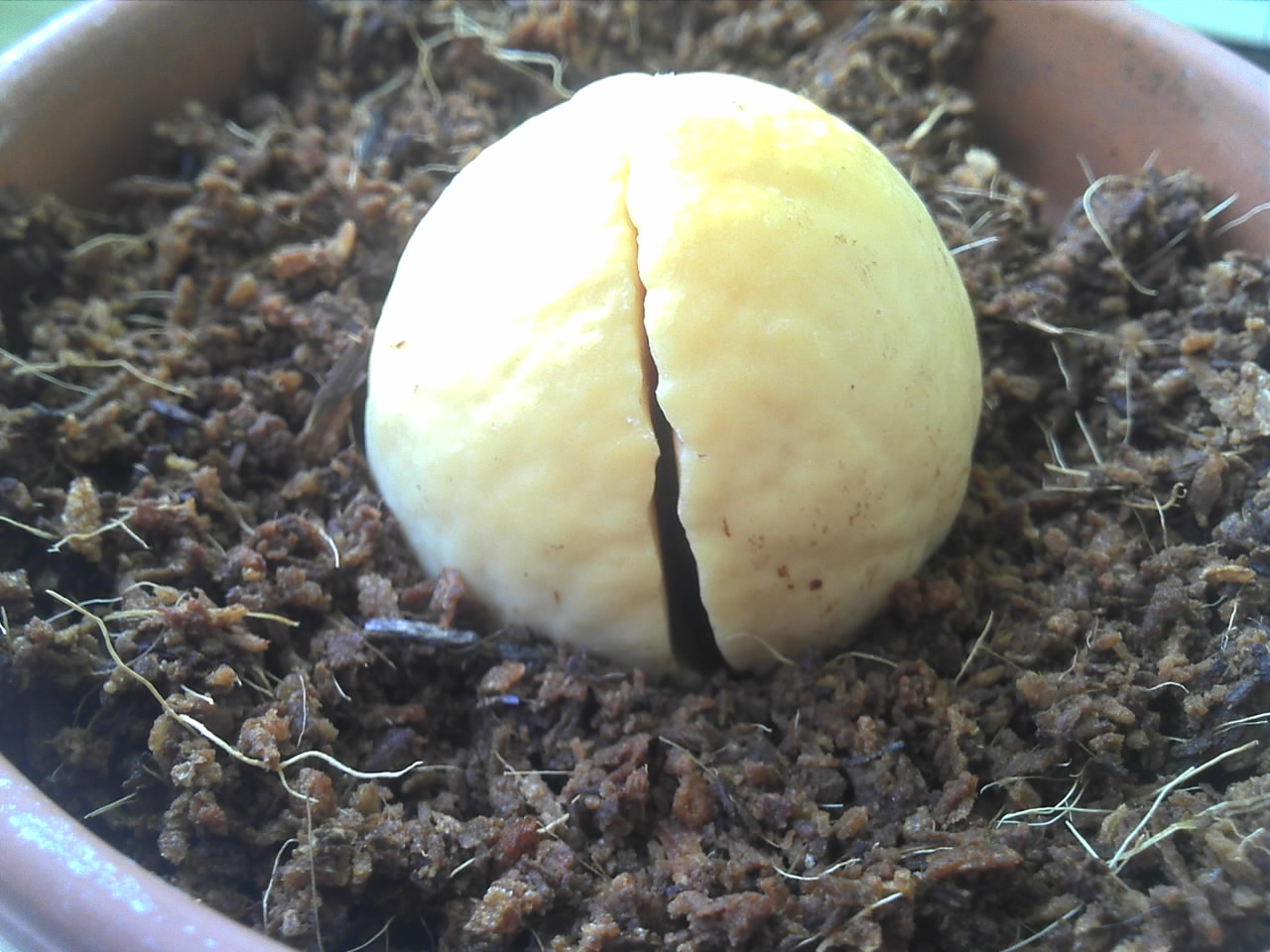 Daneben habe ich einen Vergleichskern. Er ist fast genauso lange im Wasser, aber es hat sich noch nichts geöffnet. Und es ist definitiv kein Hühnerei!