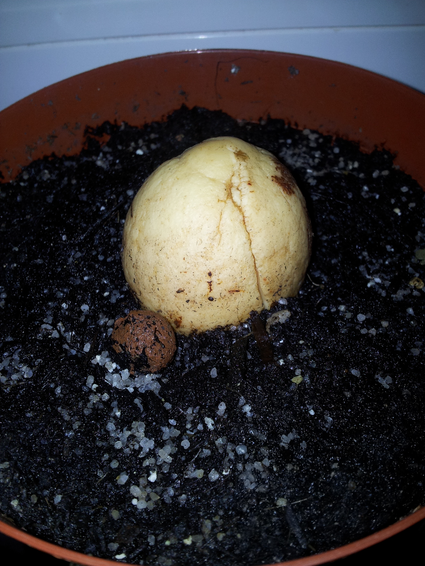 Das Kokosfasersubstrat und den Deckel hatte ich gestern mit dem Sprüher gut befeuchtet, ansonsten ist das Substrat so, wie es aus der Tüte kam, es war leicht feucht und schön locker und durchlässig. Ich hab auch nicht so gestopft beim Einfüllen, damit sich der Wurzel nicht so viel Widerstand bietet...