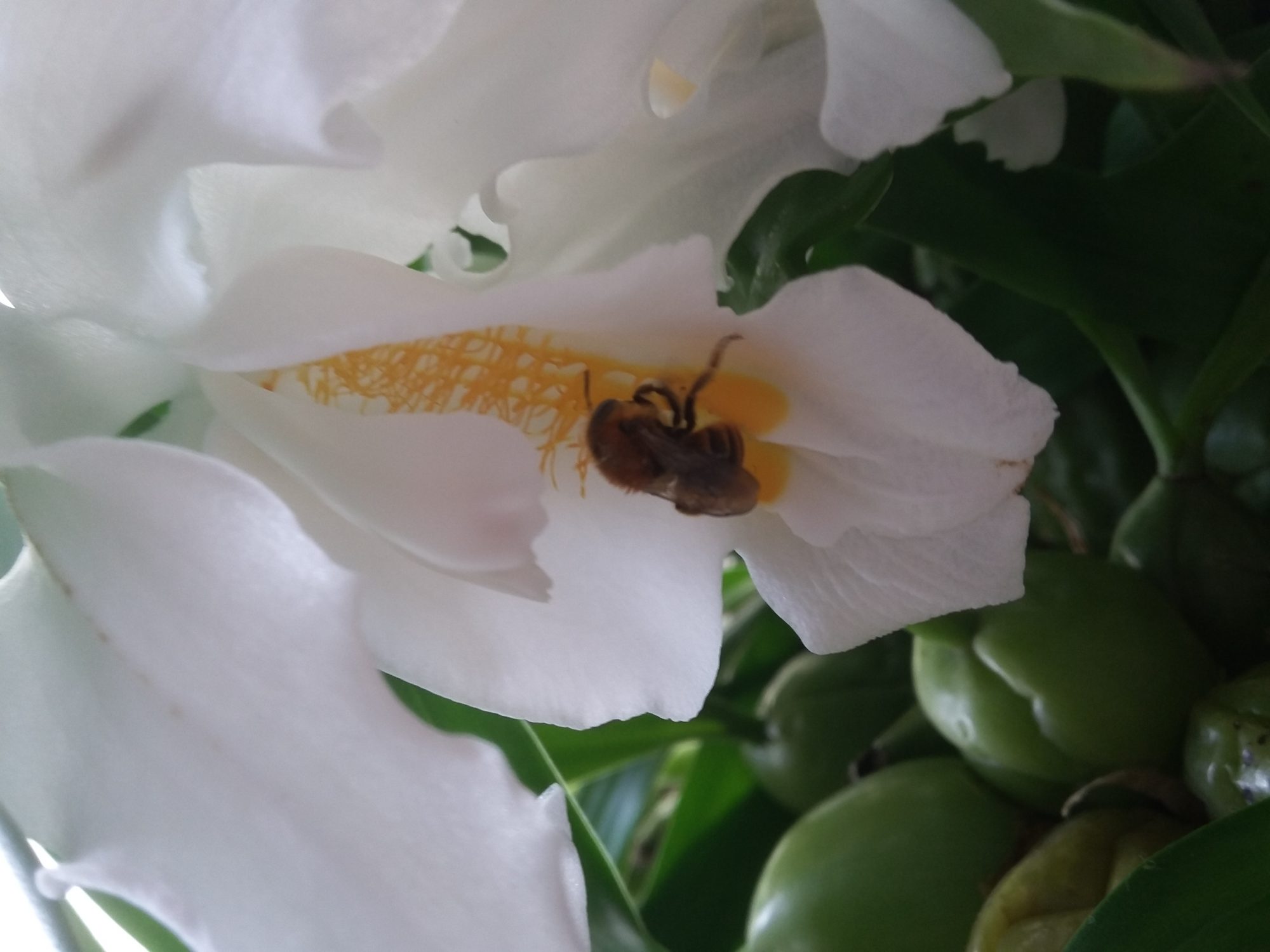 seit ein paar Tagen lebt in meiner Küche diese kleine Biene. Sie kann nicht fliegen und da ich im 2. Stock wohne, schätze ich, dass ich sie mit einer neuen Pflanze mit ins Haus gebracht habe. Wenn ich zur Küche reinkomme, läuft sie häufig auf dem Boden rum. Ich nehme sie dann hoch und setze sie in eine blühende Pflanze. Dort fährt sie dann einen recht großen Rüssel aus.