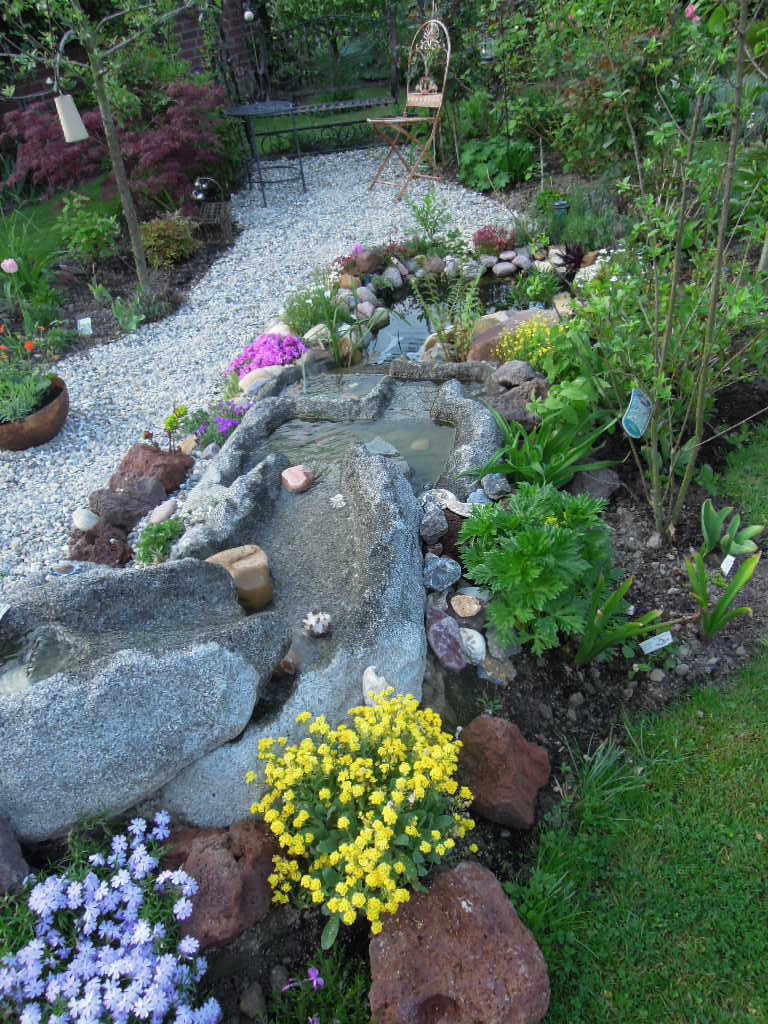 Und das ist das Ergebnis dessen, die Natursteine habe ich gebraucht gekauft, ebenso das Teichbecken für die Pumpe und dank der Hilfe meiner Nachbarn und meines Sohnes habe ich wieder ein kleines Stückchen Gartenglück mehr.