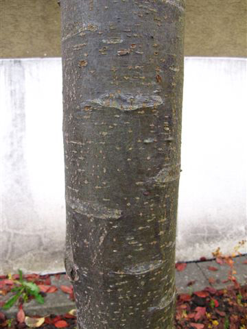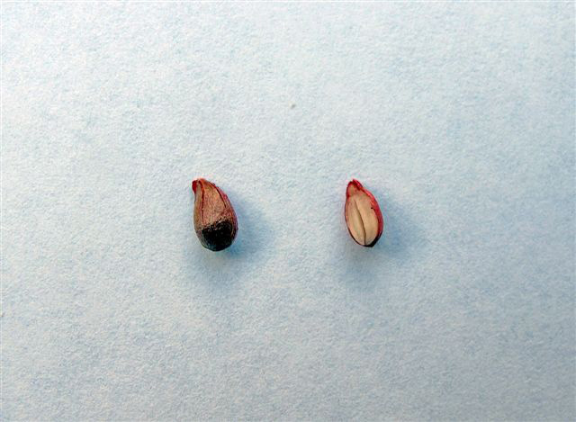 der hier abgebildete, eher hoch als breit wachsende, ca 7 od. 8 m hohe Baum steht vor einem Haus in Südbaden. Die roten, knapp 2 cm großen Früchte, enthalten im Innern, von rotem Fruchtfleich umgeben, ein einzelnes, ca 0,6 cm großes, apfelkernähnliches Samenkorn von schneidbarer Konsistenz, also keine Steinfrucht. Für einen Malus scheint mir die Baumstammrinde zu glatt. Was für ein Baum könnte es wohl sein?