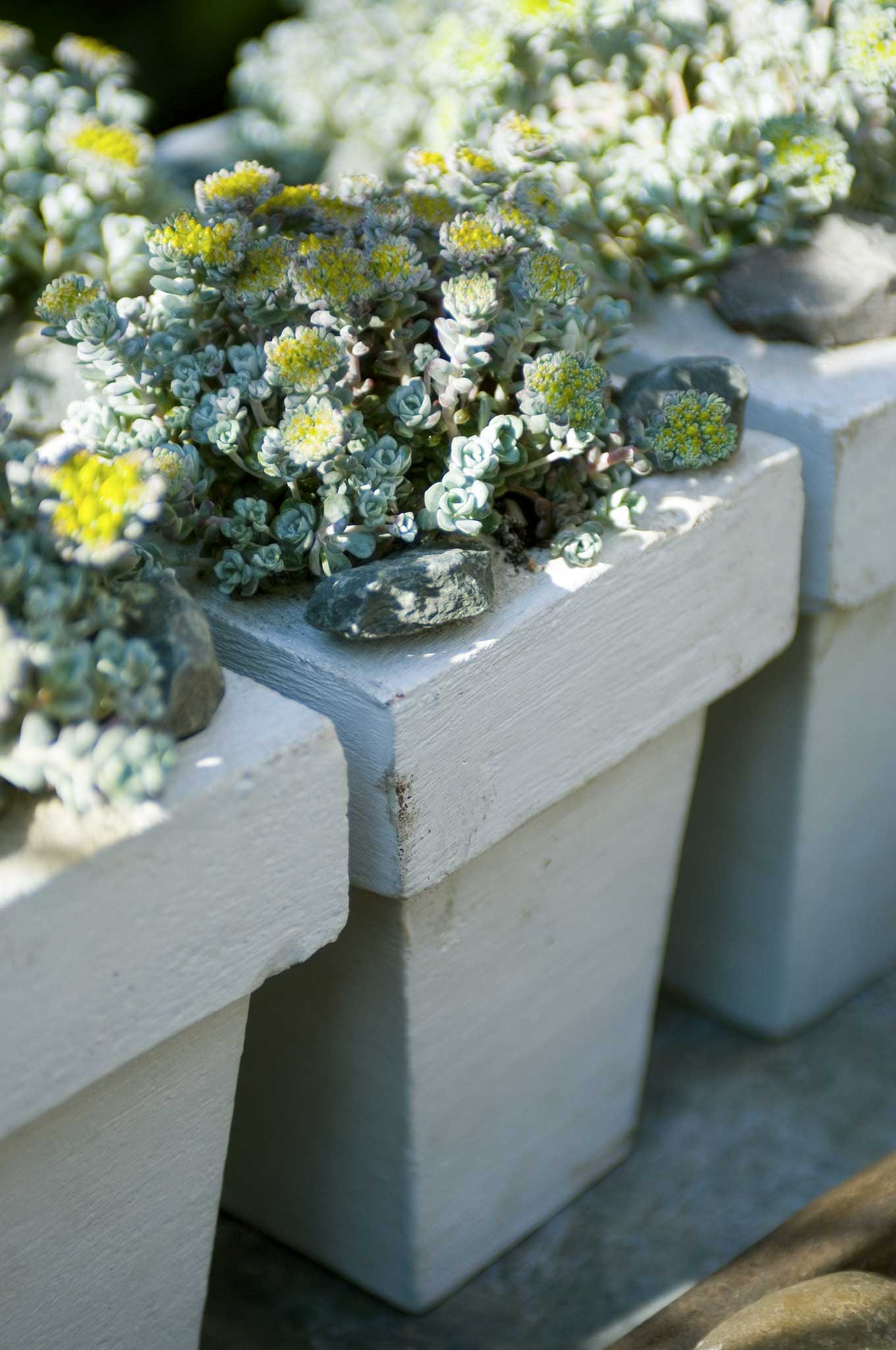 Einen schönen Kontrast zu den dickfleischigen blaugrauen Blättern der Fetthenne (Sedum) bilden im Juni ihre leuchtend gelben Blüten.
