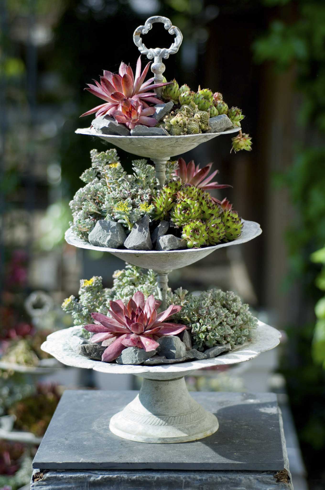 Hübsch angerichtet wachsen hier Fetthenne (Sedum) und verschiedene Hauswurz-Arten (Sempervivum) nebeneinander auf einer Etagere.