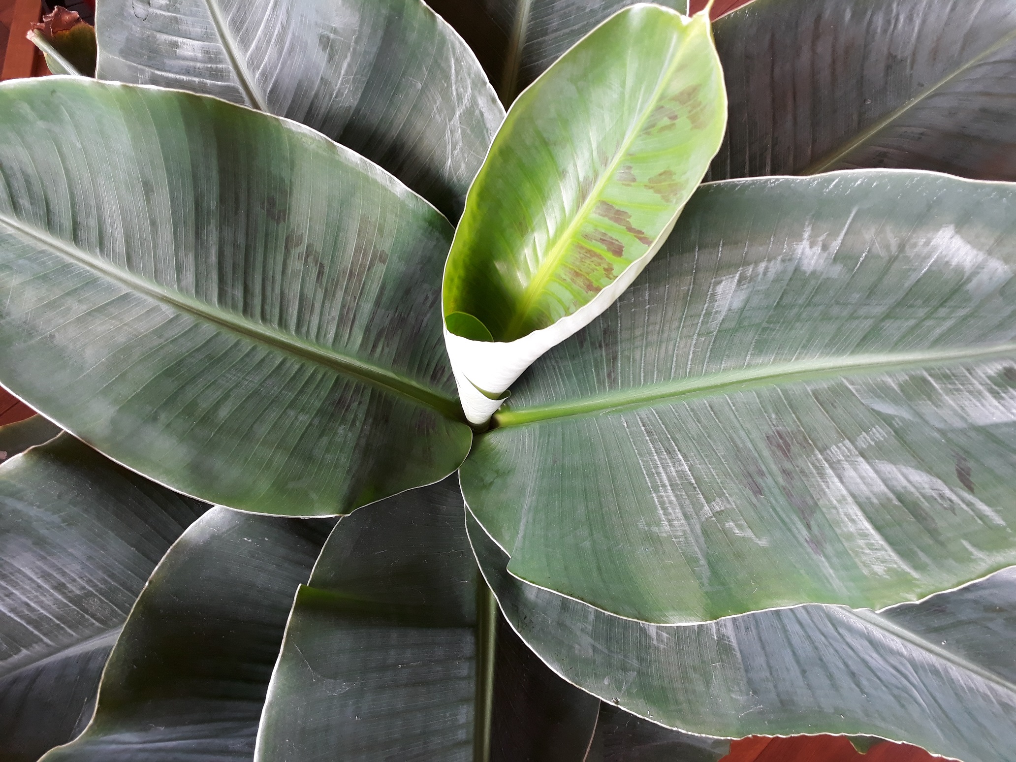 Die Banane hat über die zeit die unteren Blätter abgestoßen und immer weiter versucht in die Höhe zu wachsen. Der kleine Topf hat das aber in gewissem Maße verhindert, die Pflanze hat ab einer gewissen Höhe das Wachstum mehr oder weniger eingestellt.