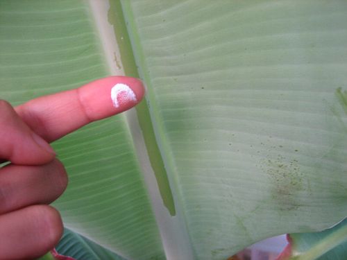 Eben habe ich gesehen, dass meine Banane auch so einen weißen Film drauf hat, allerdings ist der sehr weich und ist bereits bei den neuen Blättern dabei und war auch noch nie anders.