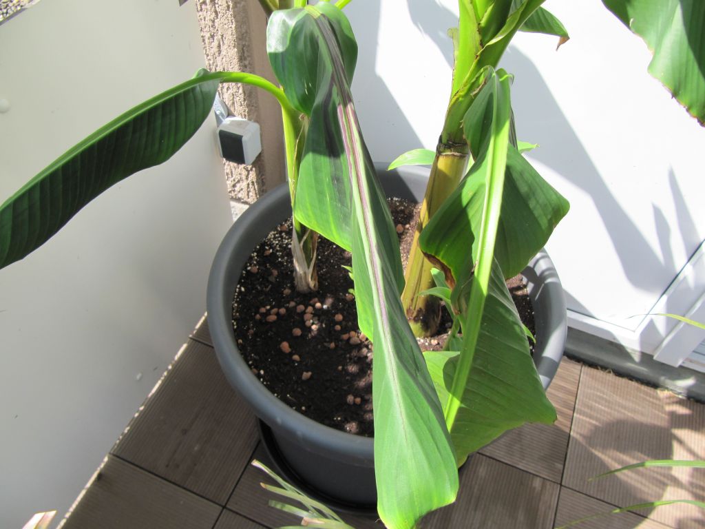 Habe die beiden seit ca. 10 Wochen. Sie hatten beide 2Blätter und waren ca. 1Meter hoch. Die Basjoo hatte schon einen kräftigen Stamm, denke, die war schon ca. 3Jahre alt. Was mich besonders begeistert sind 7neue Bananenkindl neben dem Stamm von der Basjoo