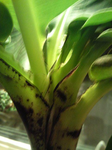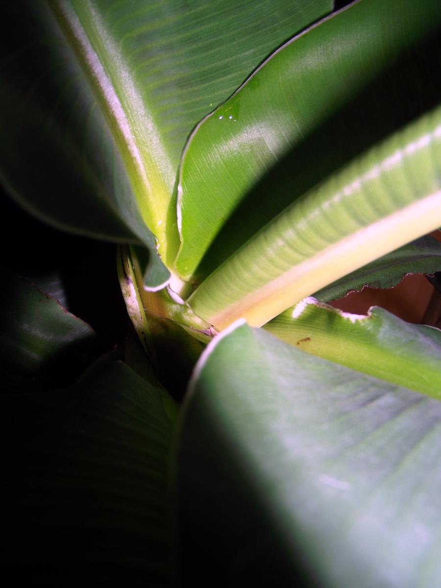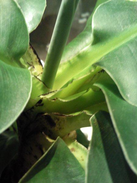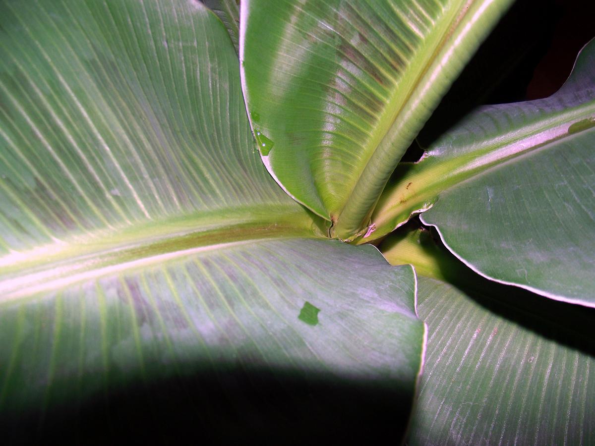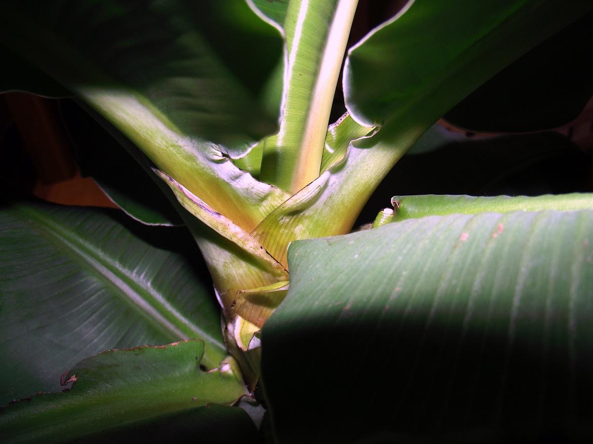 Andererseits sieht man den extrem gestauchten Wuchs dieser Musa gut. Ich hab mal überall rein fotografiert, damit man sieht wie dicht die Blätter folgen. Das ist bei dieser einen Pflanze normal und kein Grund zur Besorgnis; aber es ist der Grund warum diese Pflanze so schnell einen Blattstau bekommt, wenn ihr was nicht passt.