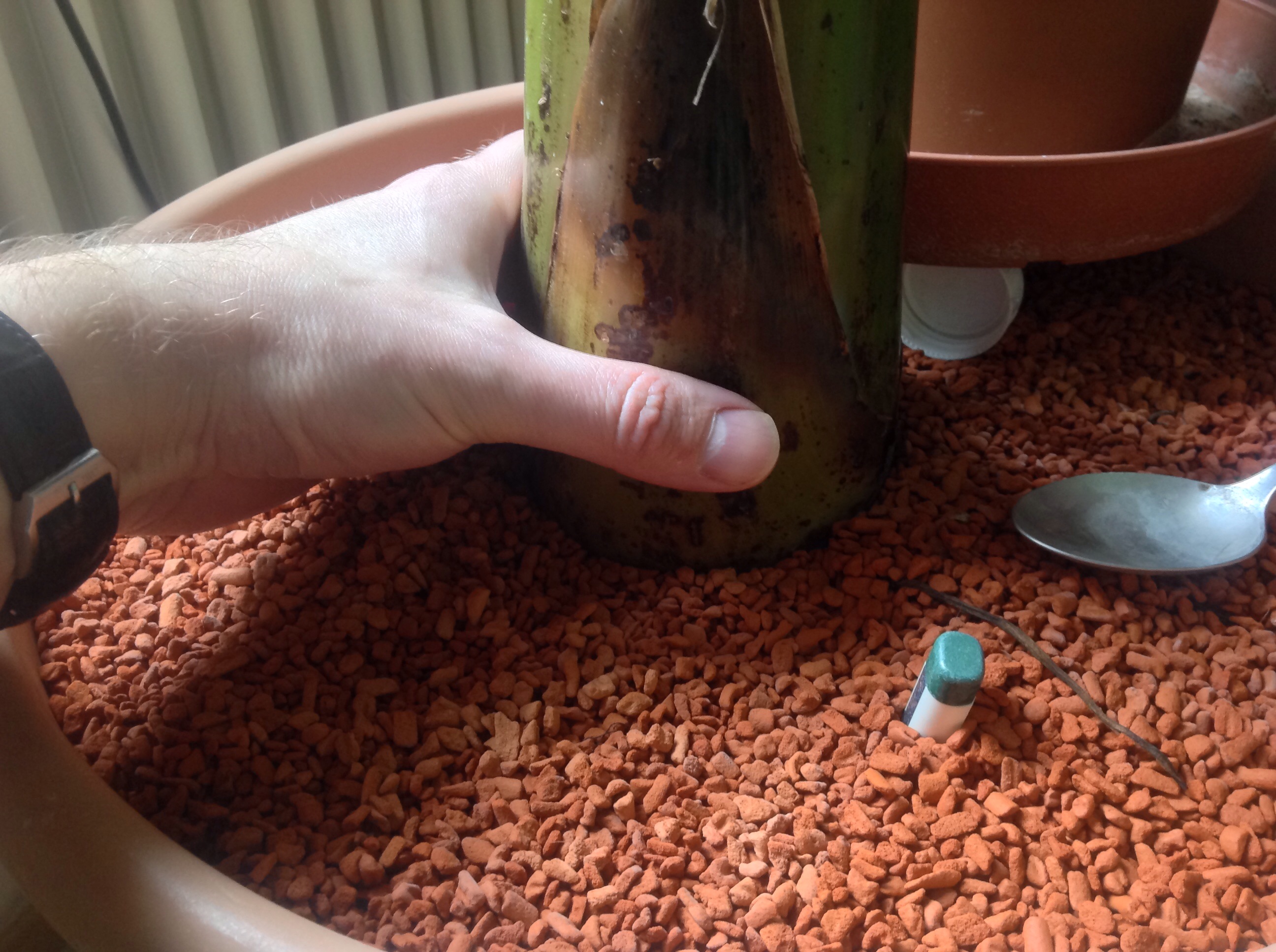 Bist Du sicher das dies eine Banane ist? Die Anordnung, die wenig kompakte Wuchsform und die Blattform mit den langen, schmalen Blattstiehlen sieht irgendwie nicht so aus; eher wie eine Pflanze, die vielleicht botanisch der Banane zugeordnet wird. Woher hast Du diese? Kleine von mir sehen zum Vergleich so aus...