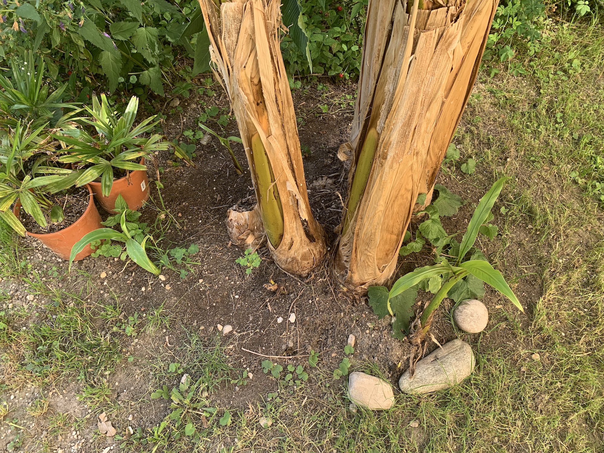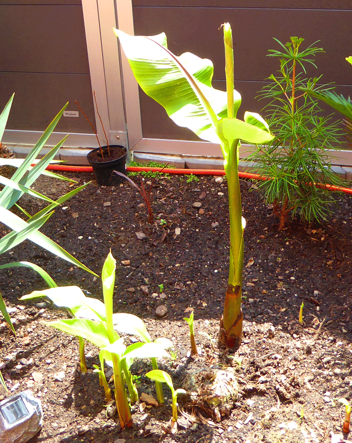 Musa Basjoo wächst dieses Jahr etwas langsamer, sieht durch den starken Hagel vor 2 Wochen außerdem noch immer ziemlich mitgenommen aus. Ein Scheinstamm hat den Winter nicht überlebt. Dafür kindelt sie weiterhin fröhlich vor sich hin.