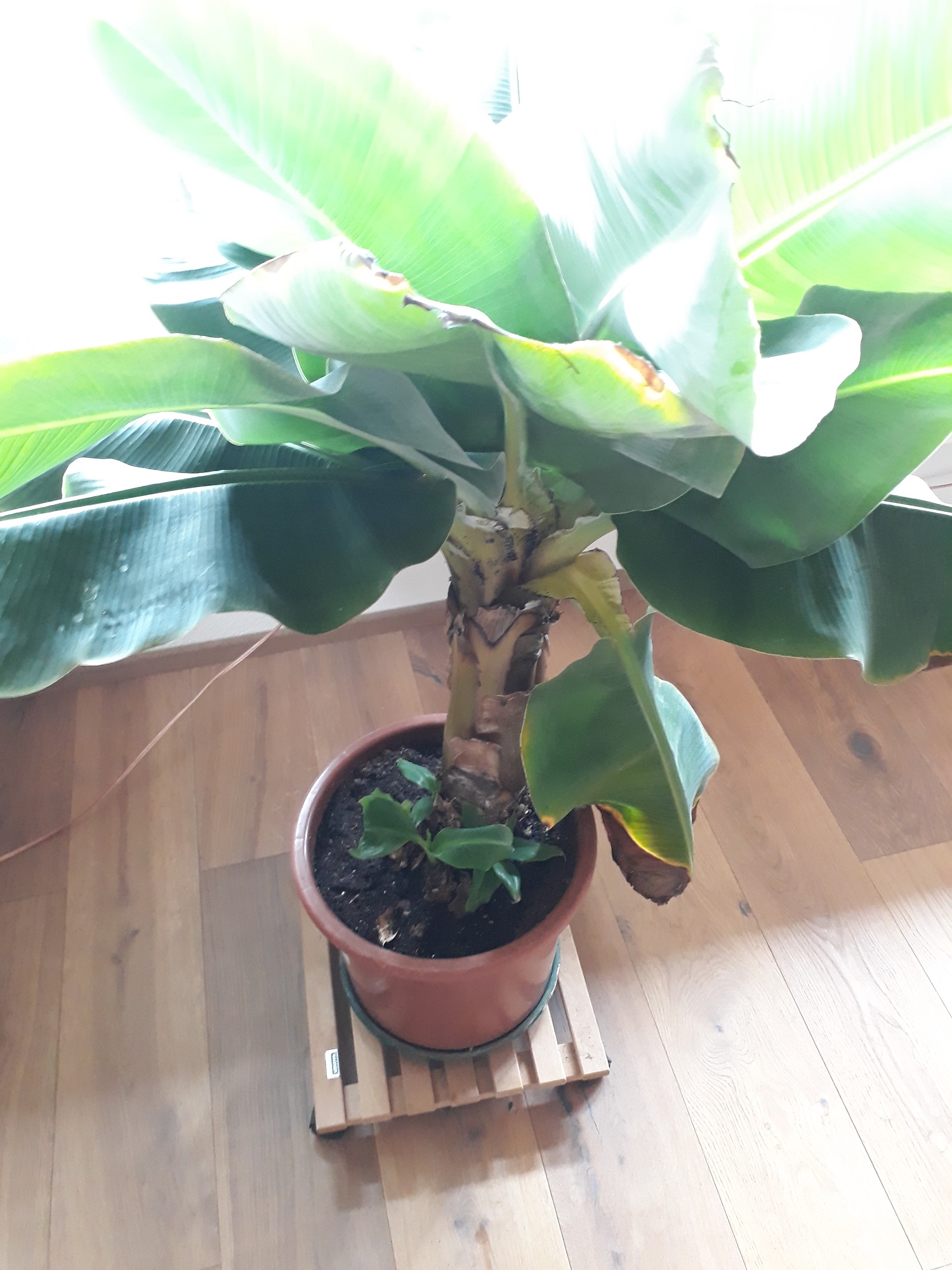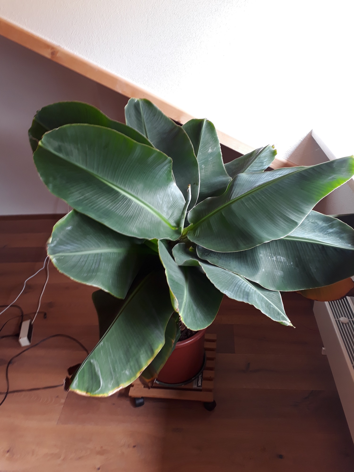 "Echte" Musa Dwarf Cavendish (also kein Baumarkt-Hybrid). Mitgenommen aus Teneriffa vor ca. 2,5 Jahren als Rhizom. Der Hauptstamm hatte diesen Winter leider Blattstau, schön langsam verwächst sich das ganze aber wieder. Das ehemalige Kindel ist inzwischen fast so groß wie die Mutterpflanze.