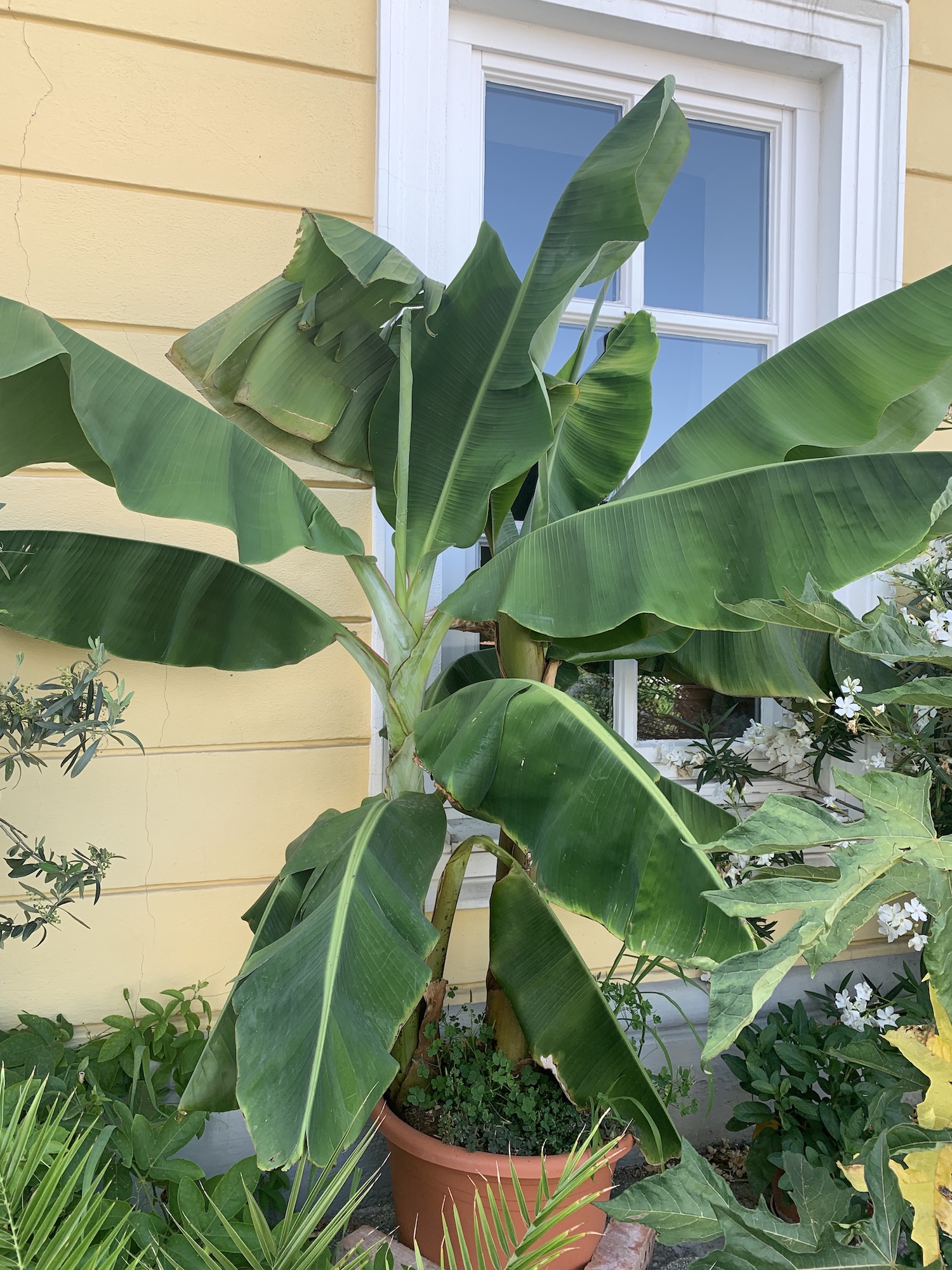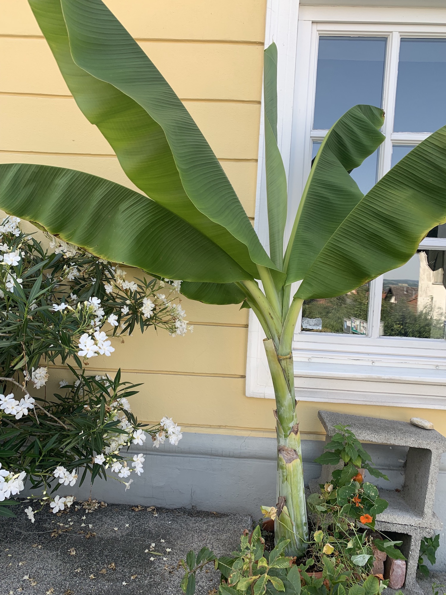 Ensete glaucum, aus Samen gezogen. Hatte letztes Jahr einen schwierigen Sommer (zu trocken) und ist mir fast eingegangen, heuer wächst sie aber wieder ziemlich gut. Der Scheinstamm ist nicht so schön weiß wie er könnte, weil ich die Pflanze vorhin aus dem Topf gehoben habe und dabei unabsichtlich relativ viel der weißen Substanz entfernt habe.
