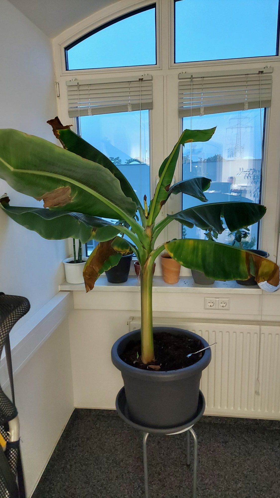 Meine Bananenpflanze müsste mittlerweile ein knappes Jahr alt sein. Nach dem ich diese das letzte mal zu spät umgetopft und an einem falschen Standort hatte, macht Sie etwas schlapp.