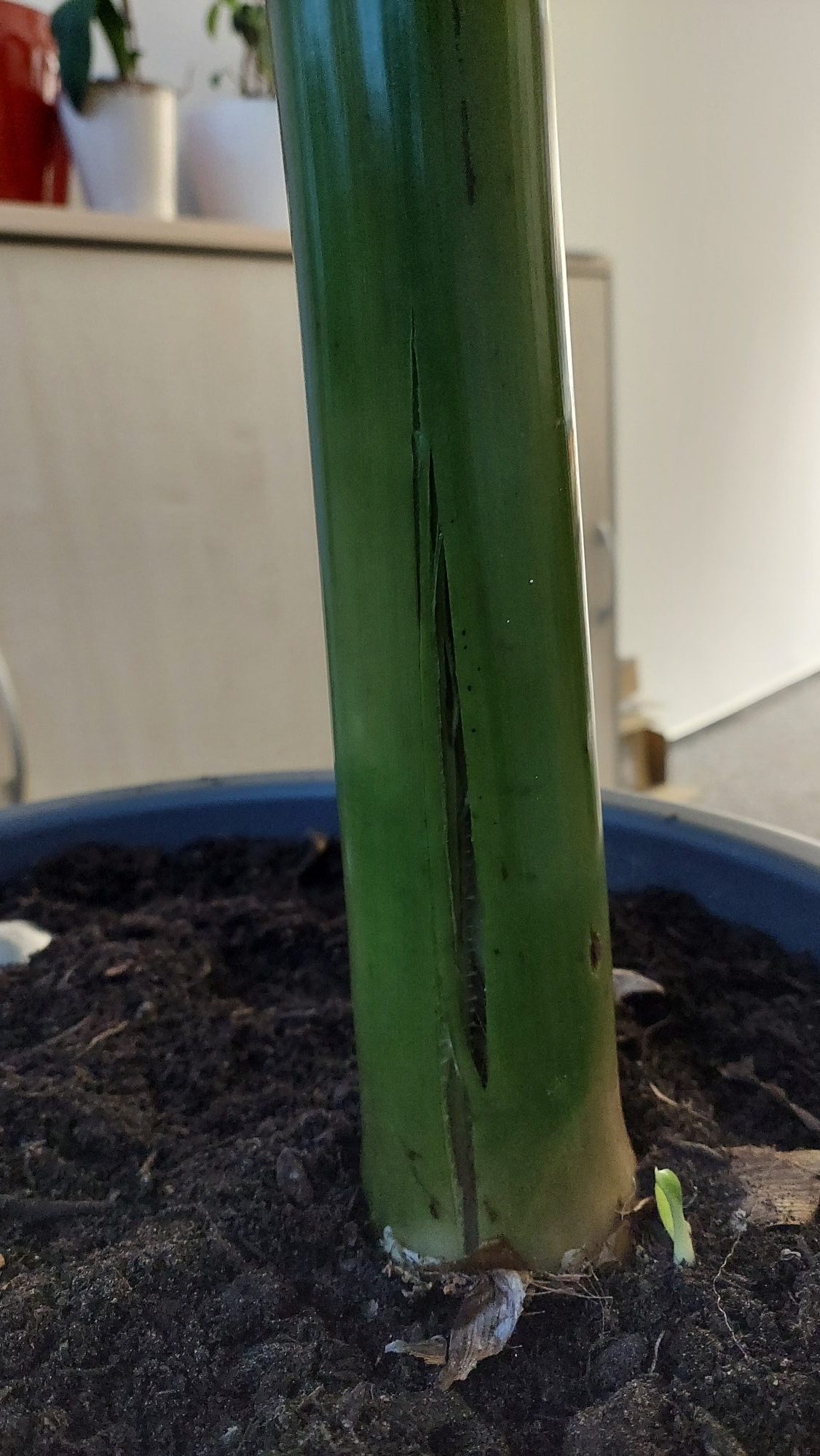 Nun hat Sie Ihren alten Standort zurück ( am Fenster an der Heizung, Erde war wohl zu feucht). Allerdings weißt der Stamm nun einen deutlichen Riss auf. Ich hoffe man kann es auf dem Bild erkennen?