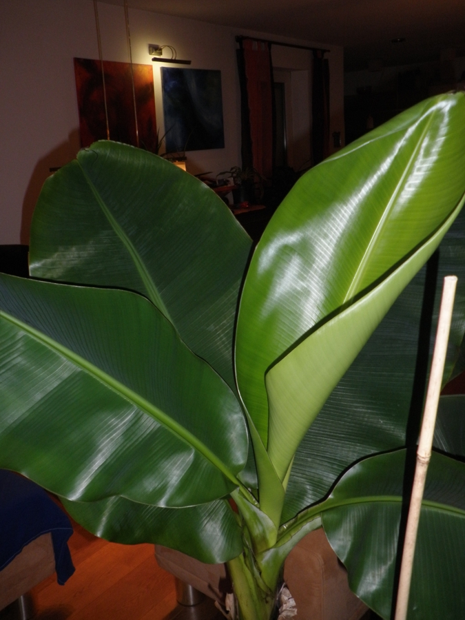 So, jetzt hab ich meine Musa Acuminata mal geknipst. Wie man sieht, sind die Blätter total einseitig und dicht. Die letzten beiden Blätter hat sie nach der Flüssigblaukornzugabe bekommen, die Stiele sind auch etwas länger als jene von den ältern Blättern. Was mich immer noch stutzig macht, ist dass im dem noch etwas eingerollten Blatt bereits schon wieder ein Neues kommt. Und sie wächst immer noch total einseitig, obwohl ich die kahle Seite zum Licht gedreht hab.