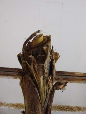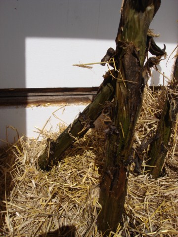 Der dicke "Mamastamm" ist aber vom fühlen her nicht total matschig..... ......um den bis zum hoffentlich heilen Stamm abschneiden zu können, müsste ich die Banane auspacken.