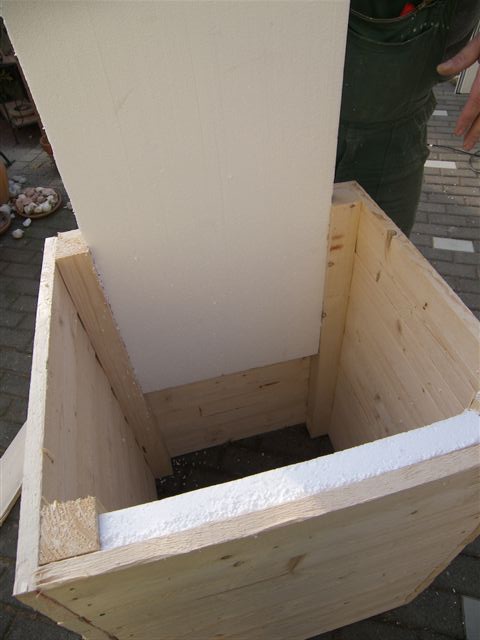 Ich werde den Holzkasten innen mit 10cm dickem Syropor isolieren und rein kommt dann Stroh und Laub.