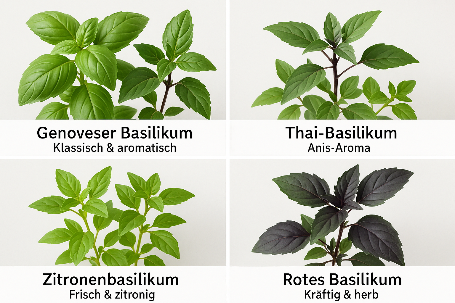 Ocimum basilicum) | Der Klassiker. Große, leicht gewölbte Blätter, intensives, süßlich-pfeffriges Aroma. | Pesto, Caprese, italienische Küche