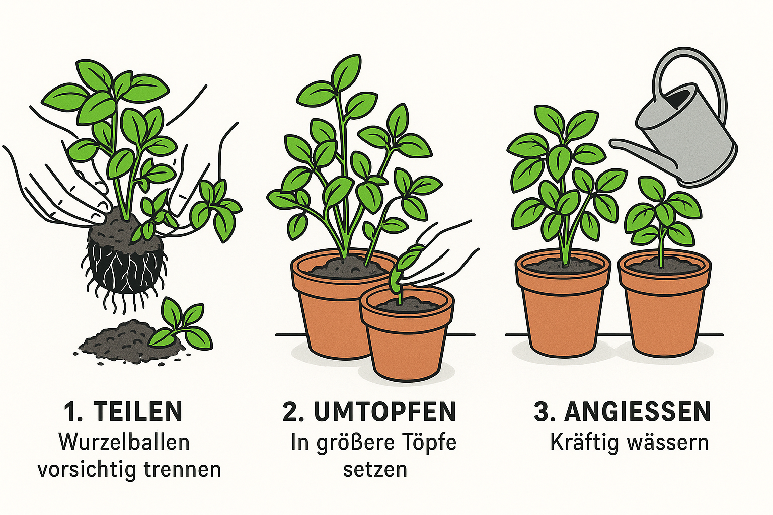 - Neues Zuhause: Pflanzen Sie jede Portion in einen eigenen, größeren Topf (mind. 15-20 cm Durchmesser) mit hochwertiger Kräutererde. Eine Drainageschicht aus Blähton am Boden verhindert Staunässe.