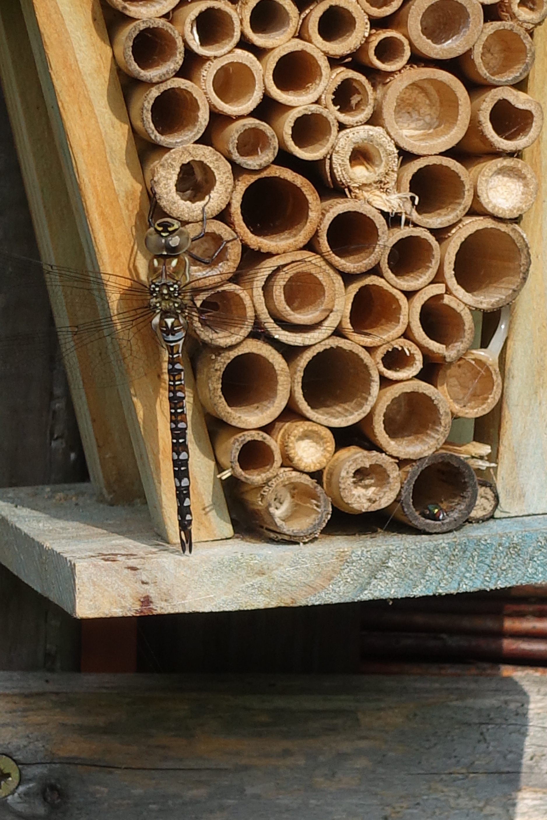 Nach diesem Erlebnis habe ich nun beschlossen, die Nisthilfe so umzugestalten, dass sie auch wirklich und vollständig für Wildbienen nutzbar ist. Zumal ich letztens irgendwo mitbekommen habe, dass in den für Bienen unnutzbaren Abteilen sehr oft die Gegenspieler der Bienen einziehen bzw. dort ruhende Ohrwürmer auch, wenn sie können, Wildbienennester ausräumen. Das wusste ich vorher gar nicht!