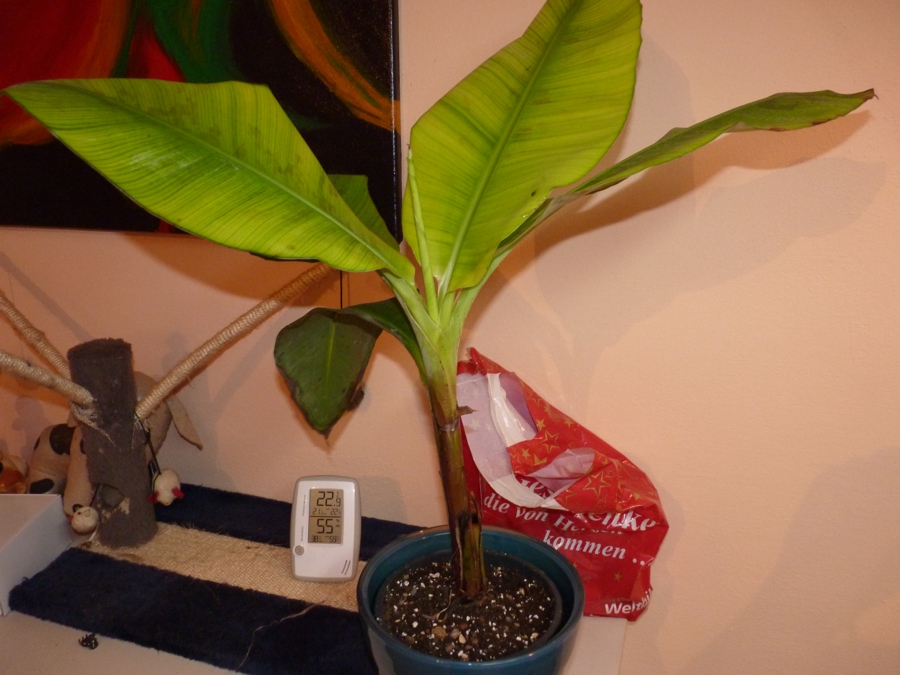 Gestern war ich wieder mal in einer der größten Gärtnereien Oberösterreichs. Als ich bei den Exoten vorbei ging, fiel mir diese Musa auf. Sie stand zwischen den "Baumarktbananen" (die alle normal aussahen - dunkelgrün mit rotbraunen Flecken). Da ich noch nie so eine gestreifte Musa gesehen hab, mußte sie natürlich mit zu mir nach Hause und um Euro 2,50 kann man nicht viel falsch machen.