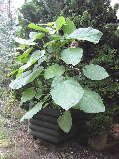 Die Tamarillo wirde voriges Jahr aus einem Steckling von Achim gezogen, im September 06 habe ich sie mir dann mit 50 cm geholt ... jetzt ist sie 140 cm ab TOK. Das größte Blatt ist 40 cm lang .... von Blüte leider noch keine Spur!