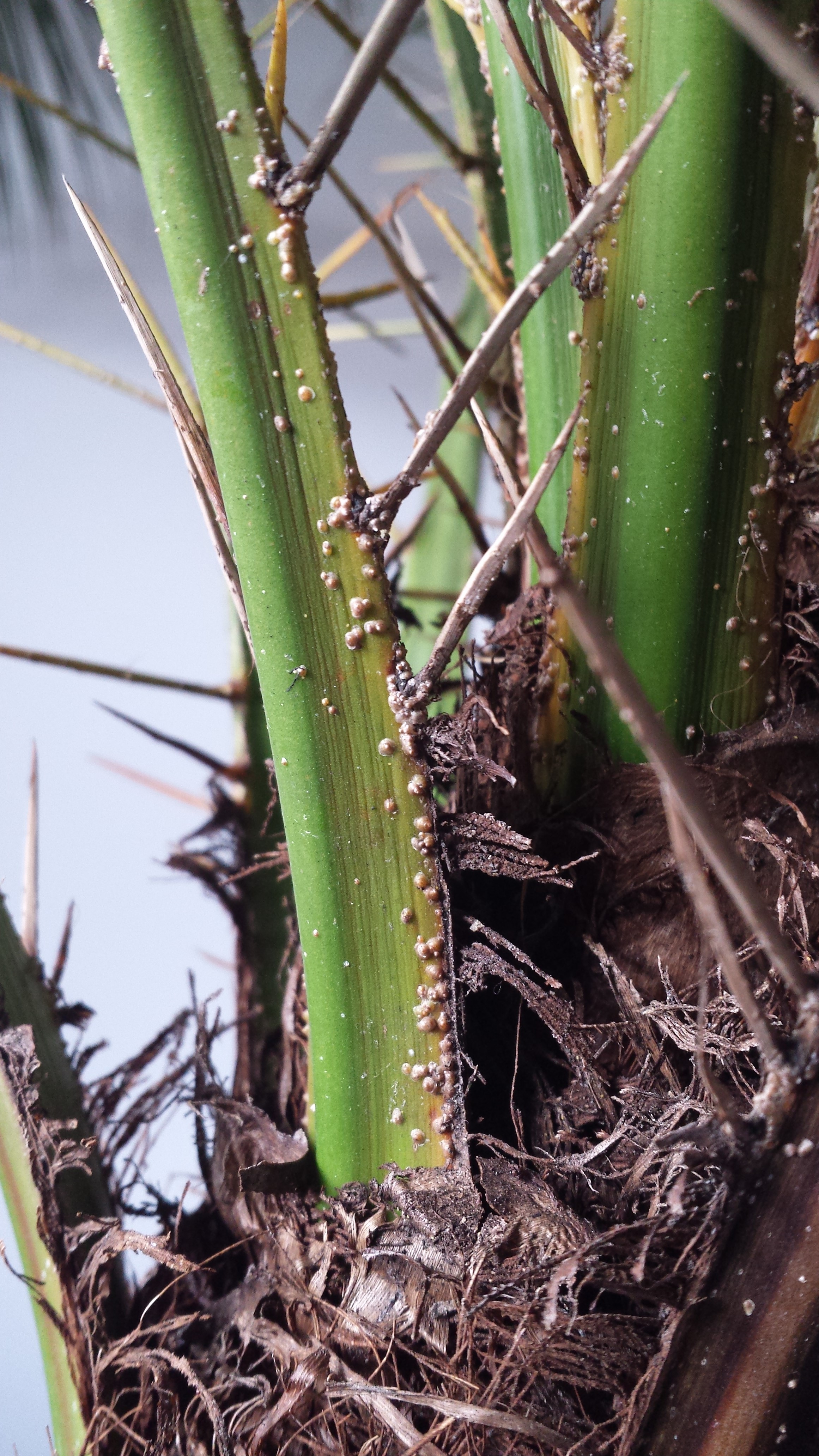 Nun zum Problem: seit ca einem Monat starben bereits 3 Wedel ab, einige restliche Wedel bekamen eine hellgrüne bis gelb/braune Farbe. Ausserdem haben alle Wedel eine braune Substanz (Pilz? siehe Foto) kleben. Ich befürchte dass etwas der Palme zu schaffen macht... Ich werde die braune Substanz (Pilz?) bei jedem einzelnen Wedel nun mit Küchenrolle abwischen. Bezüglich Licht denke ich nicht dass die Palme zuwenig Licht bekommt, da wie bereits erwähnt, die Palme seit 1,5 Jahren am selben Platz steht und neue Wedel nachgewachsen sind. Ich dachte ausserdem daran den Wasserabfluss etwas zu drosseln, vielleicht floss das Wasser zu schnell ab und die Palme leidet an Wassermangel...