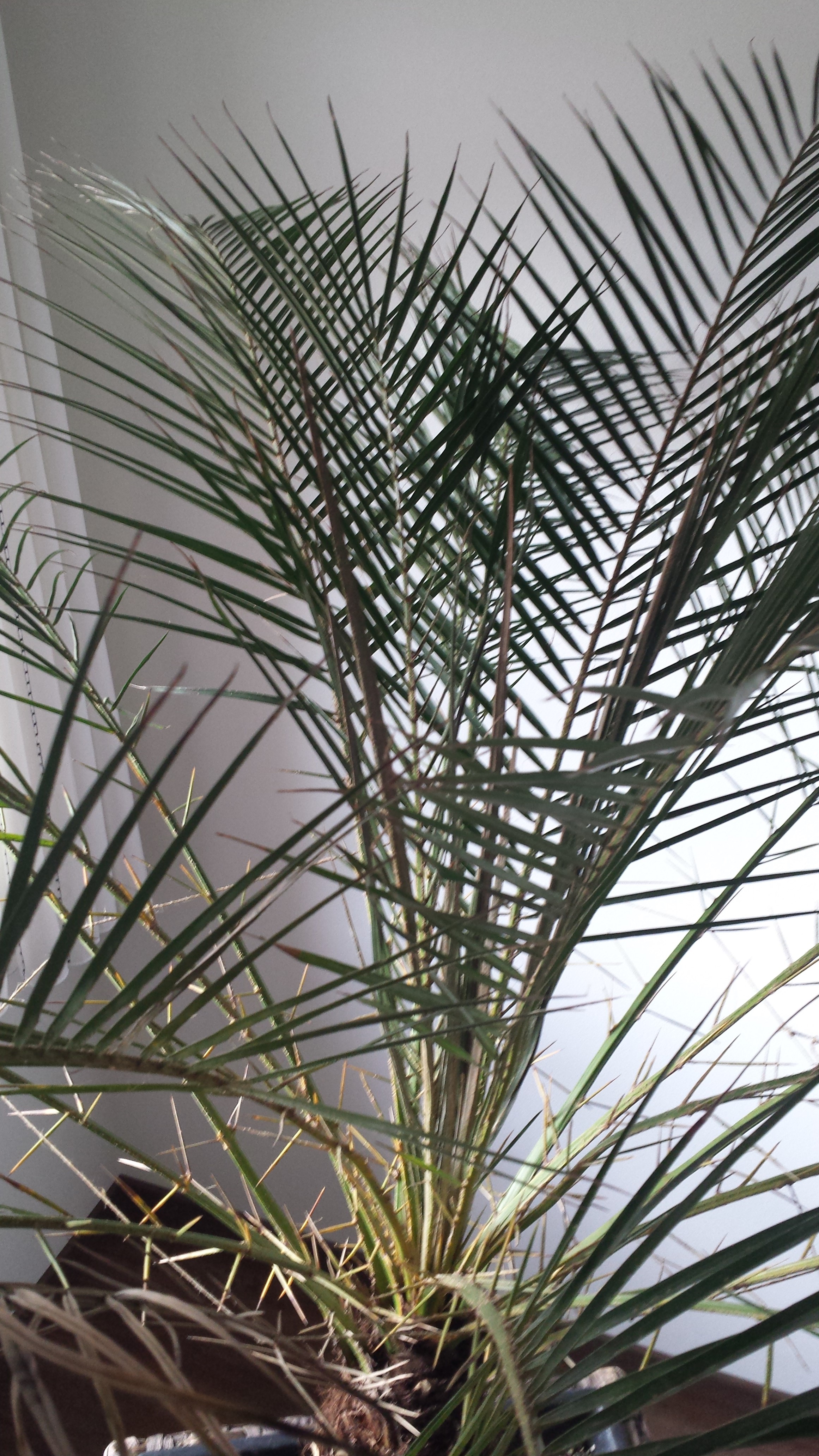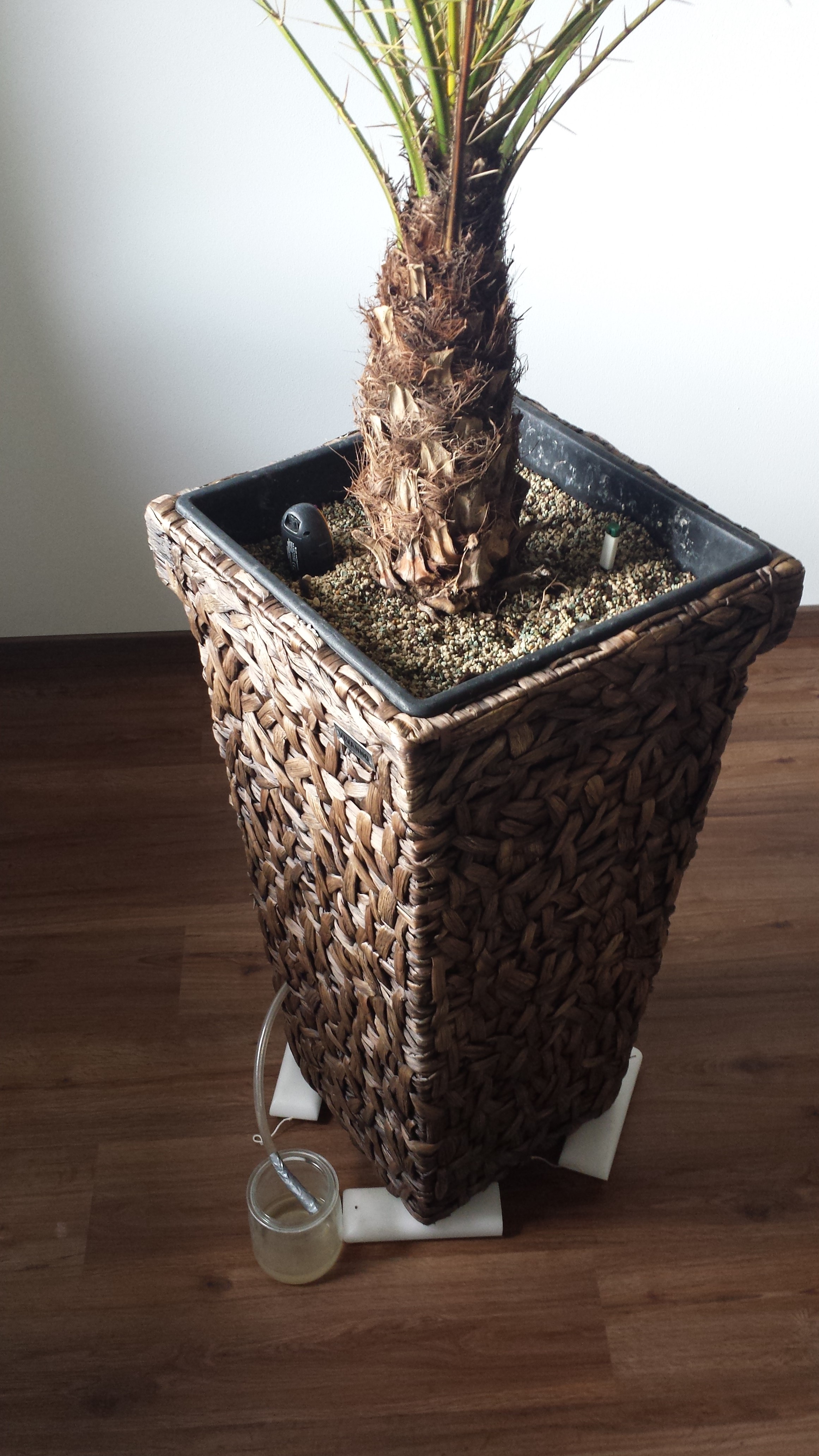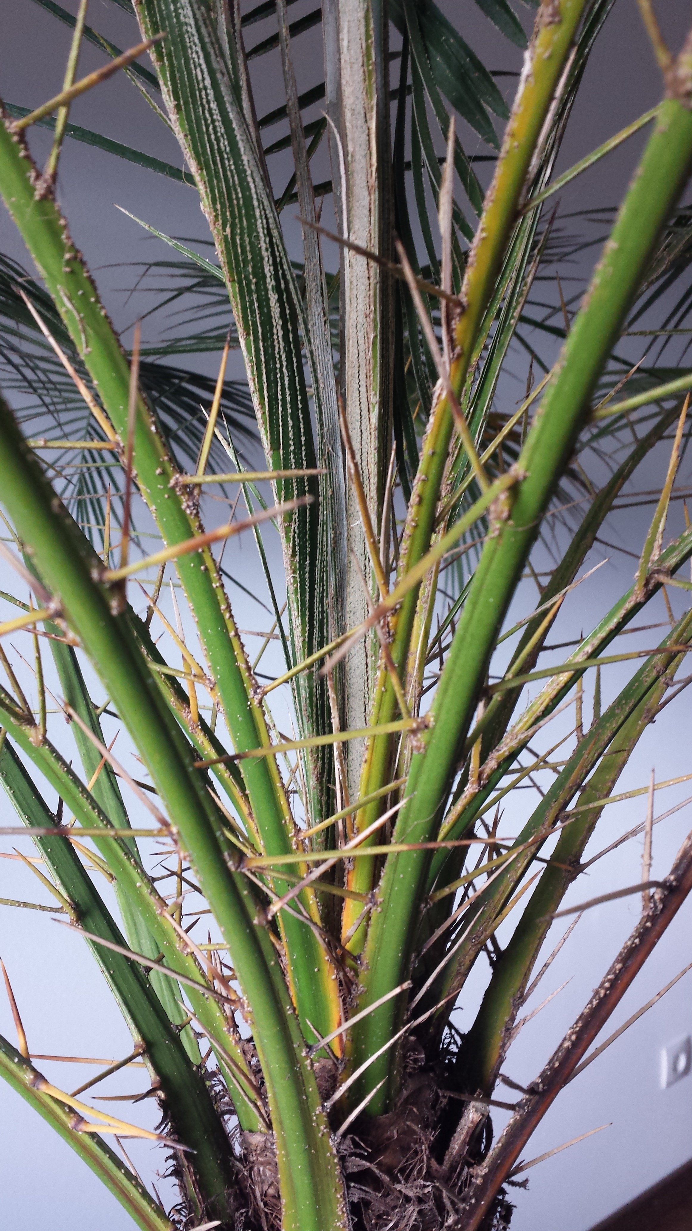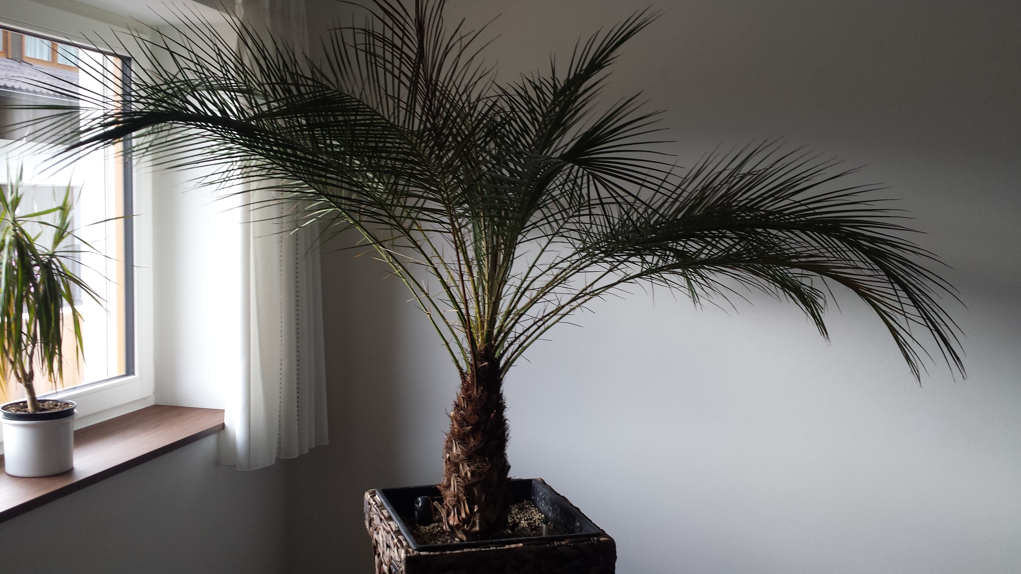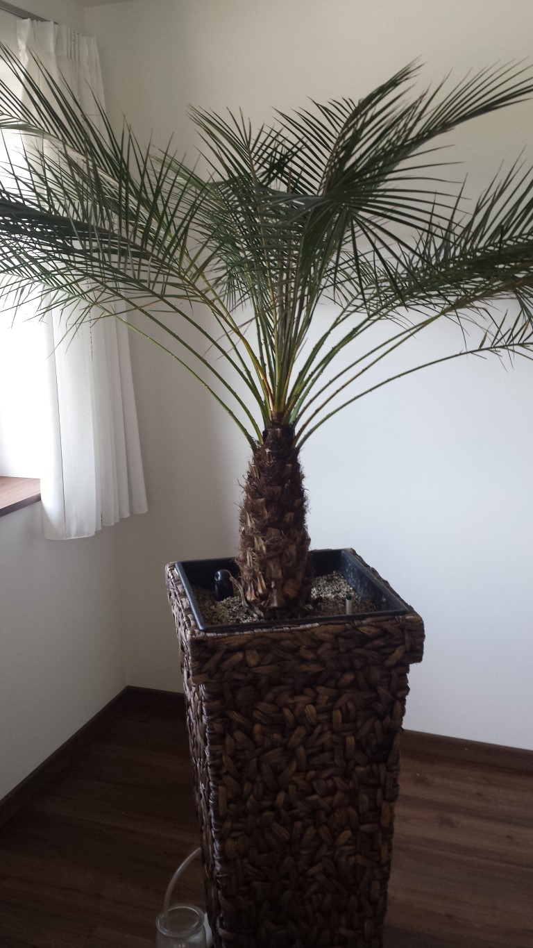 ich habe meine Phoenix Roebelenii nun bereits seit 1,5 Jahren. Sie stand immer am selben wohl temperierten Platz (18-21°C) vor einem Fenster mit süd-west Ausrichtung. Mit der Zeit starben ein paar Wedel starben ab, was denke ich normal ist, da genügend neue Nachkömmlinge sprießen. Die Palme wurde vor einem Jahr in einen ausreichend großen Kübel gesetzt welcher mit Lechuza PON Granulat gefüllt ist. Da ich eine Überwässerung verhindern wollte, habe ich vor dem Einsetzen der Palme eine Stein/Fließdrenage mit Ablauf installiert. Die Palme wird einmal wöchentlich mit ca. 2 Liter gegossen und jeden 2. Tag besprüht.