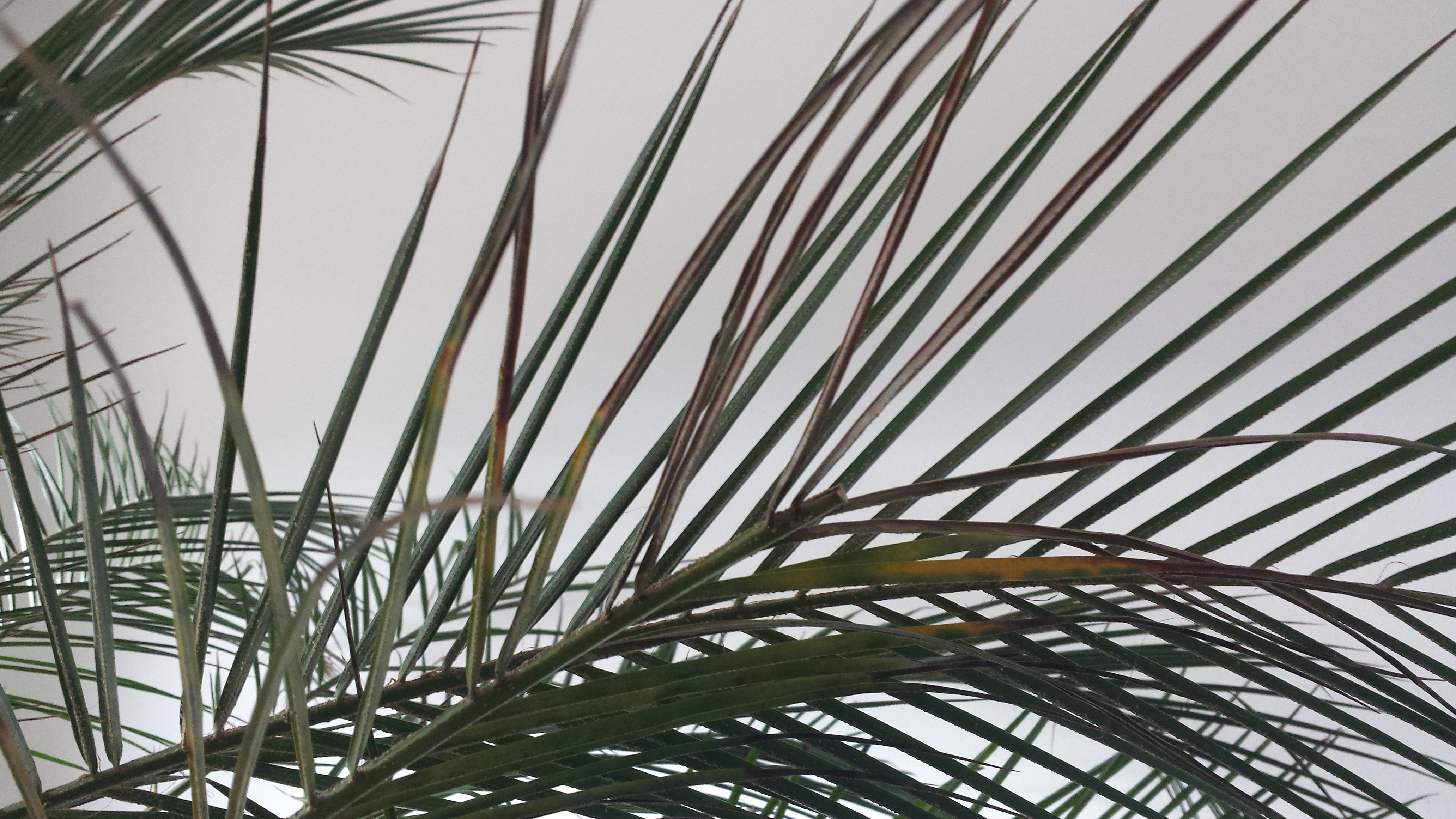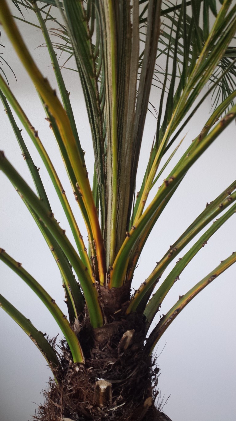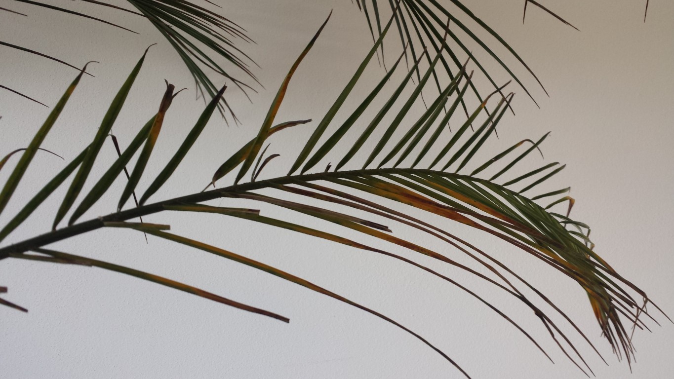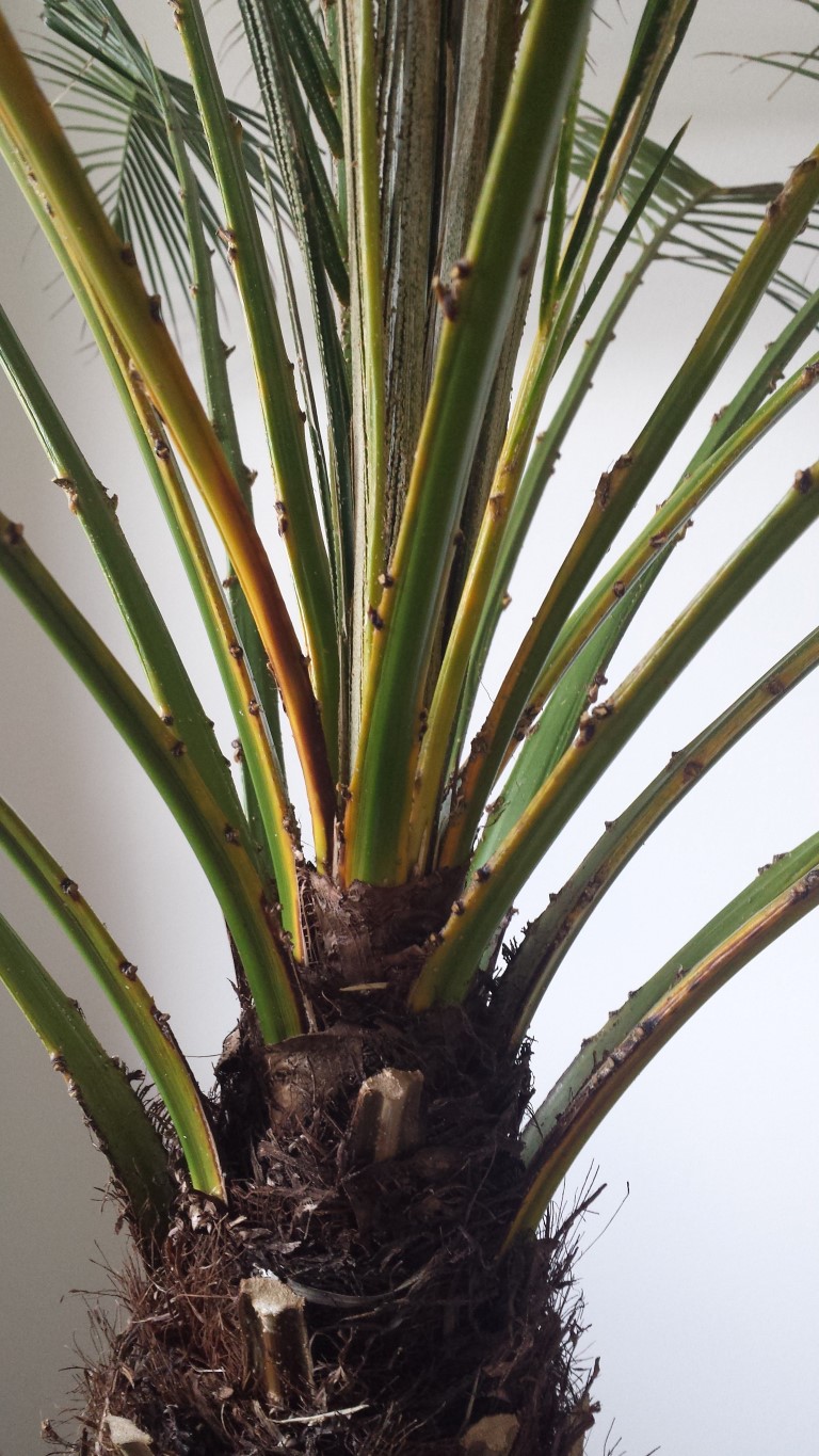 Nun zum Problem: seit ca einem Monat starben bereits 3 Wedel ab, einige restliche Wedel bekamen eine hellgrüne bis gelb/braune Farbe. Ausserdem haben alle Wedel eine braune Substanz (Pilz? siehe Foto) kleben. Ich befürchte dass etwas der Palme zu schaffen macht... Ich werde die braune Substanz (Pilz?) bei jedem einzelnen Wedel nun mit Küchenrolle abwischen. Bezüglich Licht denke ich nicht dass die Palme zuwenig Licht bekommt, da wie bereits erwähnt, die Palme seit 1,5 Jahren am selben Platz steht und neue Wedel nachgewachsen sind. Ich dachte ausserdem daran den Wasserabfluss etwas zu drosseln, vielleicht floss das Wasser zu schnell ab und die Palme leidet an Wassermangel...