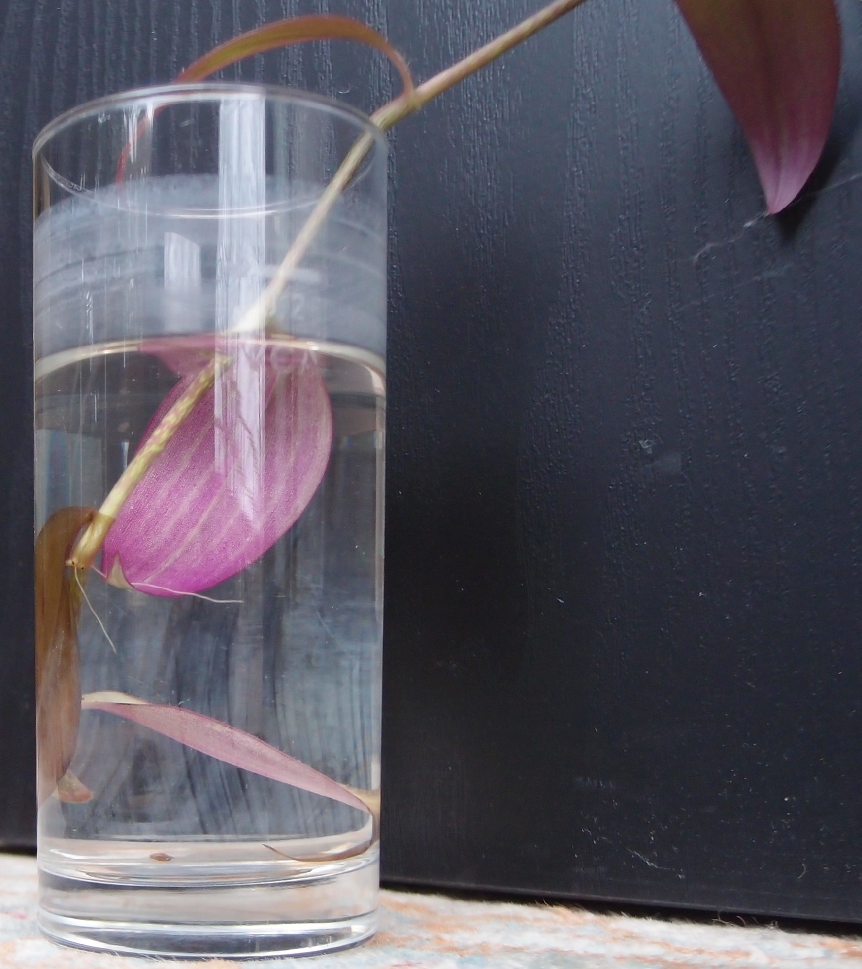 Sie haben auch schon kleine Wurzeln gebildet (siehe beiliegende Fotos - bei dem unteren Bild sind die beiden bisher vorhandenen Wurzel-"Fädchen" unterhalb des lila-Blattes der Tradescantia - etwa in der Mitte - zu erkennen).
