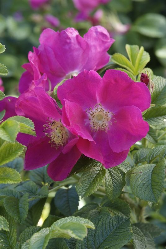 Nicht zu vergessen sind einfach blühende Rosen, die den Bienen Fitnessfood bieten. Dazu gehört zum Beispiel die Rosa rugosa, auch Kartoffelrose oder Sylter Rose genannt. Ihre Blüten erscheinen Ende Mai und bis September finden sich immer neue Blüten dunkelrosa am Strauch. Nach der langen Blütezeit entwickeln sich große, rote Hagebutten. Die berühmte englische Gärtnerin Gertrude Jekyll bezeichnete die Hagebutten der Rosa rugosa als „kleine runde Äpfelchen, die den Charme, die Anziehungskraft und die Faszination der Kartoffelrose noch verstärken". Gepflanzt werden Wildrosen an Böschungen, zur Grundstücksbegrenzung oder als Sichtschutz. Sie bilden eine undurchdringliche Hecke und sind ebenso schmückend wie pflegeleicht.