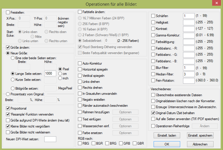 Wichtig ist nur der Bereich "Größe ändern", der im hier gezeigten Bild auch mit einem Häkchen markiert ist. Die Einstellungen sind übrigens die, die ich für meine Batch-Konvertierung nutze: