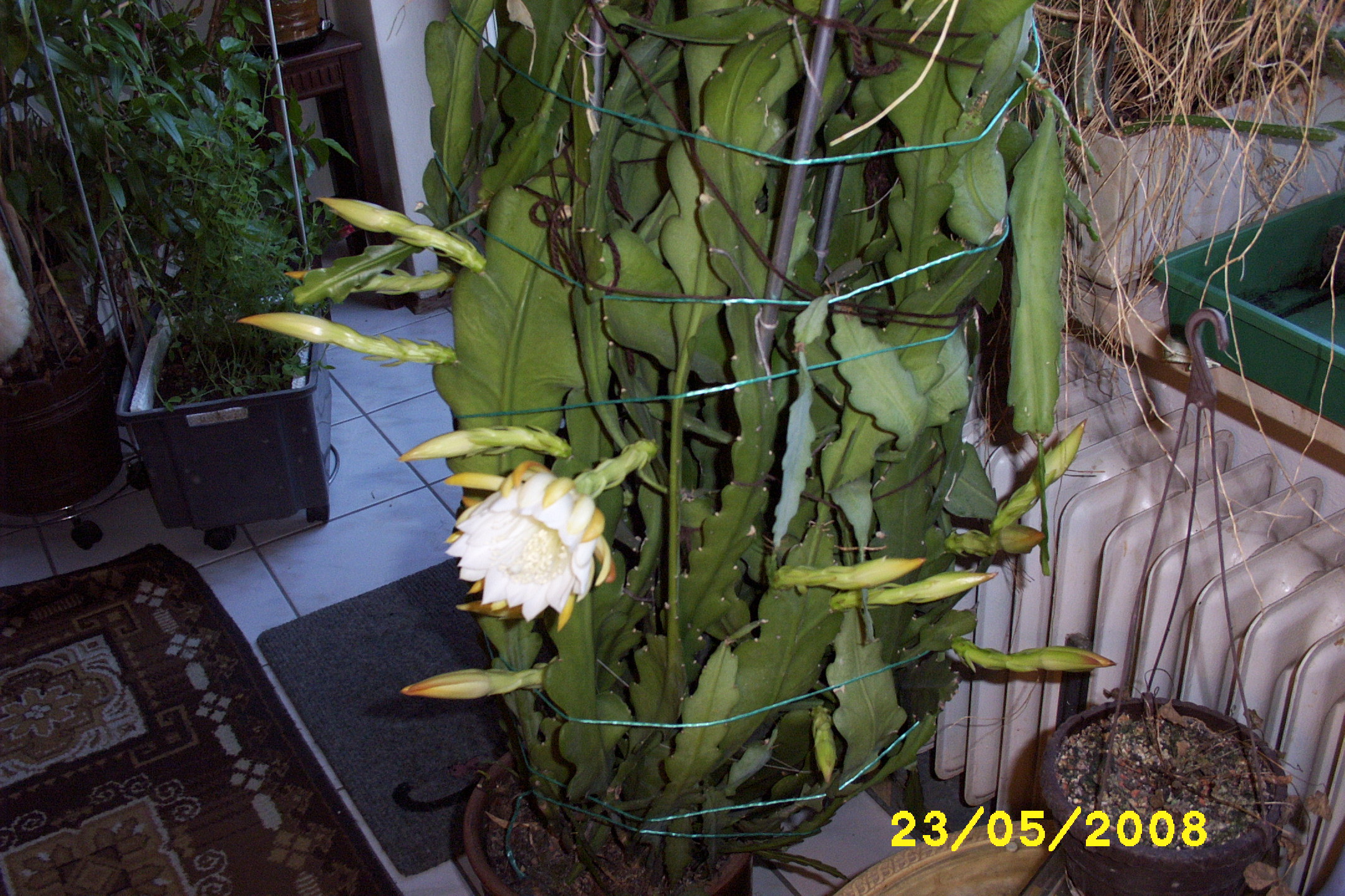 Es ist wieder so weit. Gestern Abend ging die erste Blüte der "Roten Königin" (Selenicereus grandiflorus X Heliocereus speciosus) auf. Fünf weitere werden hoffentlich noch folgen.