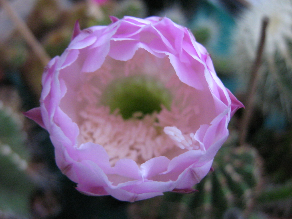 http://www.ferokaktus.de/andere/subdenudata01.jpg sieht die ursprüngliche Pflanze (Echinopsis subdenudata) aus. Durch Hybridisierung wurden die Puschel (Glochiden) etwas ausgeprägter und die Rippen etwas runder. Ob das Auswirkungen auf die Blüten hatte, muss man abwarten.