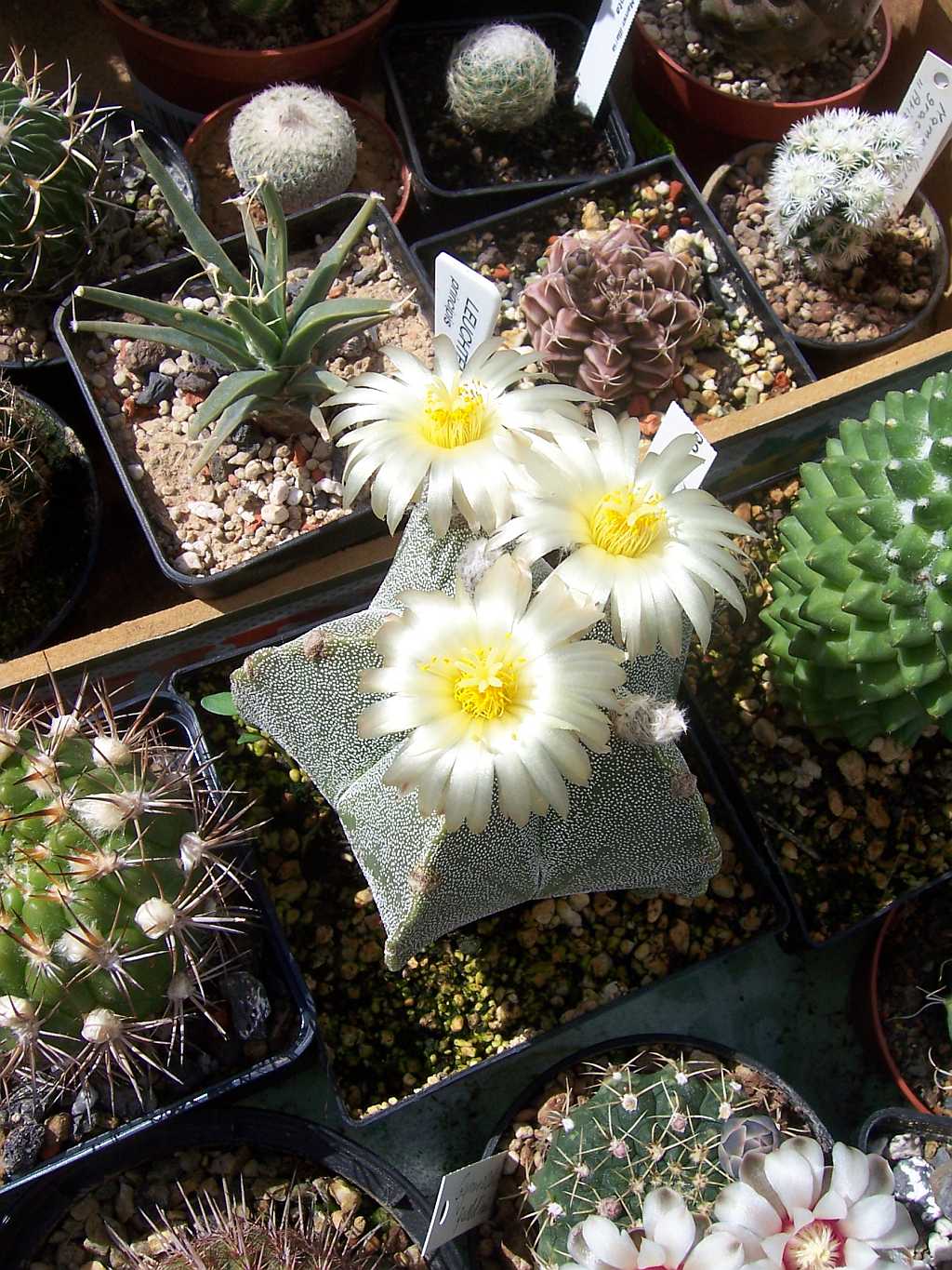 Ganz links vorletztes Bild ist eine Echinopsis oder Lobivia, der ganz rechte ist ein Astrophytum ornatum, eine Hybride davon.