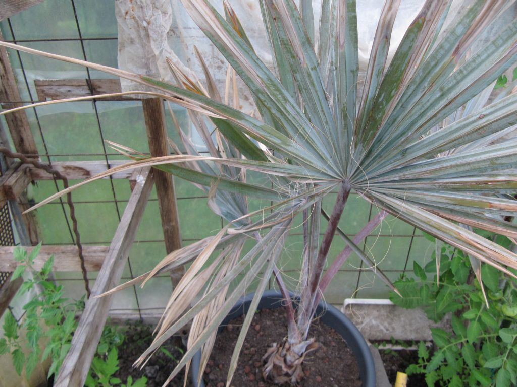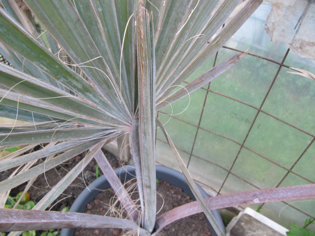 habe mir vor ca. 2Monaten eine Bismarckia Nobilis gekauft. Am Anfang sah sie wirklich schön aus. War damals leider noch nicht so informiert wie heute und habe sie gleich umgetopft und auf die Dachterasse gestellt. Zu der Zeit wurde es Nachts noch ca. 3°C kalt und es regnete sehr oft. Dachte mir, das wird sie schon verkraften