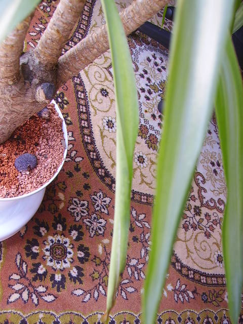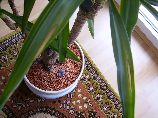 Zuersteinmal sollte die Yucca aus dem Übertopf raus, in einen Kunststoffkübel, der gern wieder in den Übertopf gestellt werden kann.