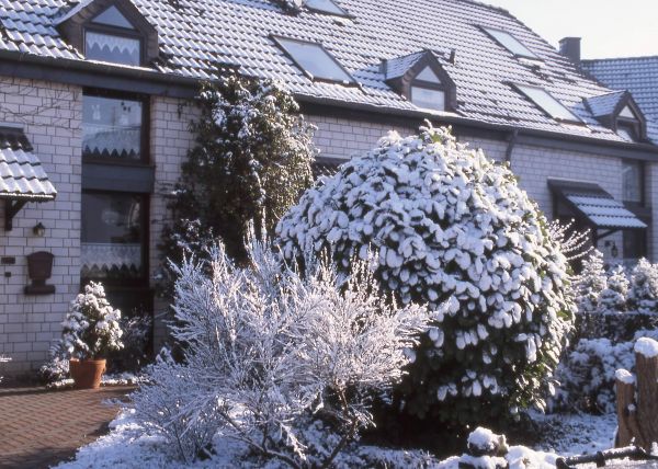 - In Form geschnittene immergrüne Gehölze wie Eiben und Buchsbaum sind im winterlichen Garten besonders wirkungsvoll. Die Umrisse und Formen werden durch die Schneedecke noch verstärkt.