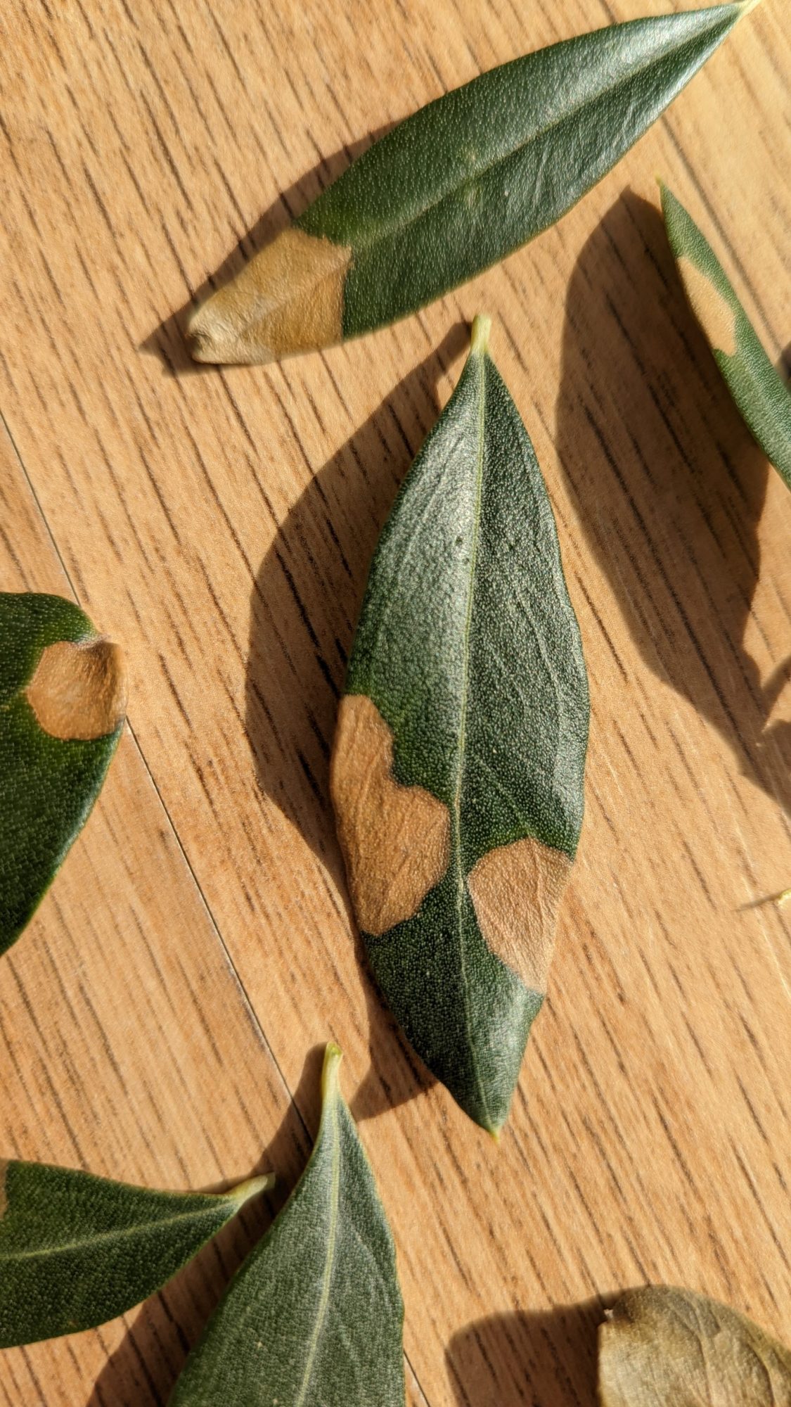 Die Blätter haben braune Flecken. Manche sind abgefallen. Die meisten bleiben aber dran.