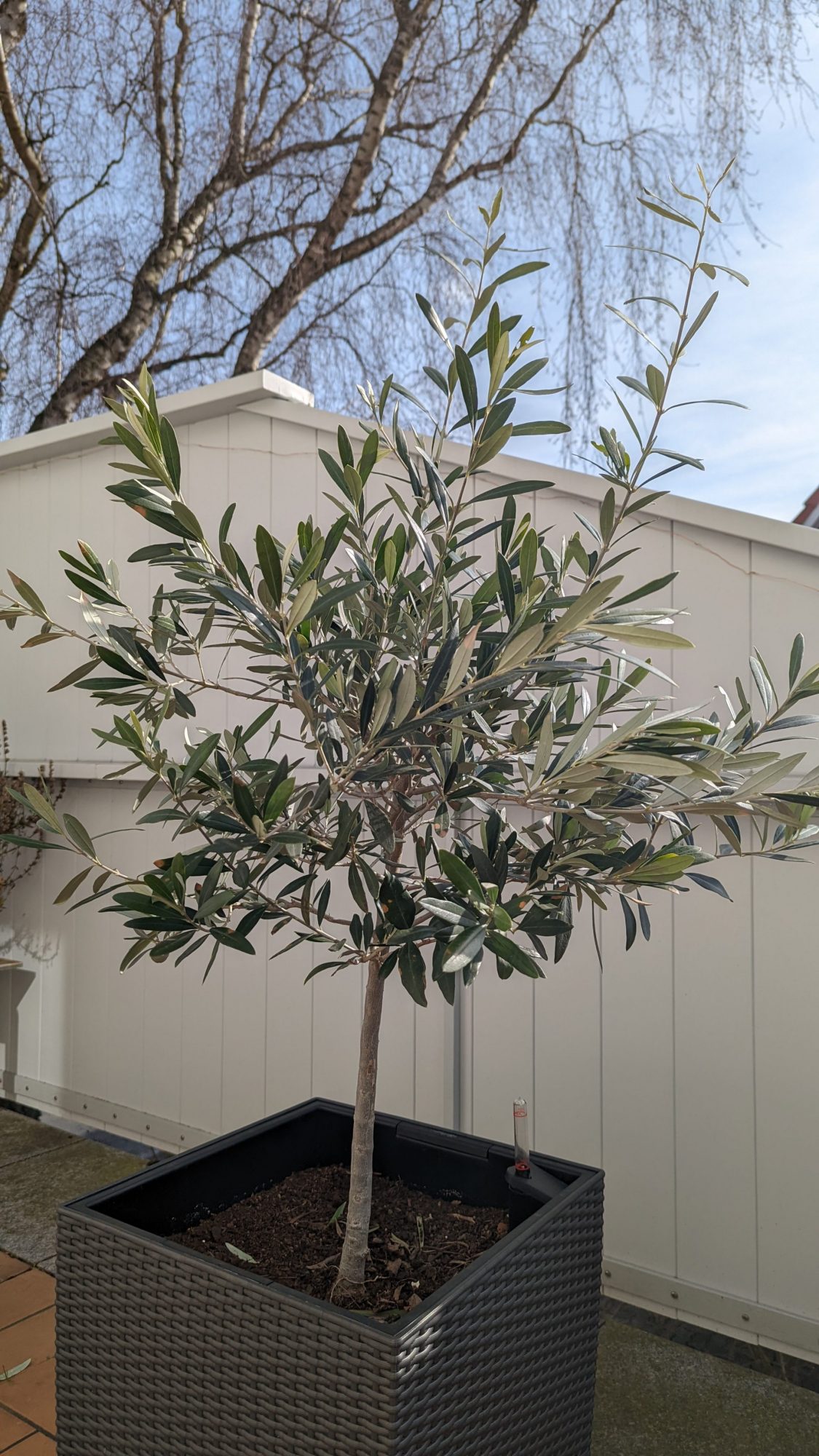 Ich habe den Olivenbaum nun bereits 3,5 Jahre. Er wuchs soweit ganz und alles war gut. Aber der Olivenbaum hat ein hartes Jahr 2020 druchgemacht, da meine Nachbarn zwar alle meine Zimmerpflanzen während meines Urlaubs gegossen haben, aber meinen Balkon komplett vergessen hatten. Damals sind alle Pflanzen auf dem Balkon gestorben. Der Olivenbaum hatte fast alle Blätter verloren, war aber noch am Leben: Beim Abkratzen der Rinde war darunter aber zum Glück alles grün.: Vitaltest bestanden!