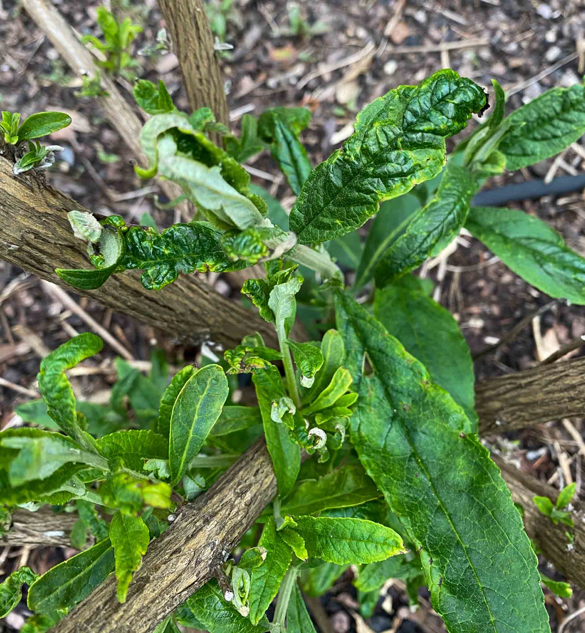 Seit einiger Zeit kräuseln und verkümmern die Blätter an den Neuaustrieben von meinem Sommerflieder. Schädlinge kann ich nicht entdecken. Was könnte das sein… Pilzbefall?