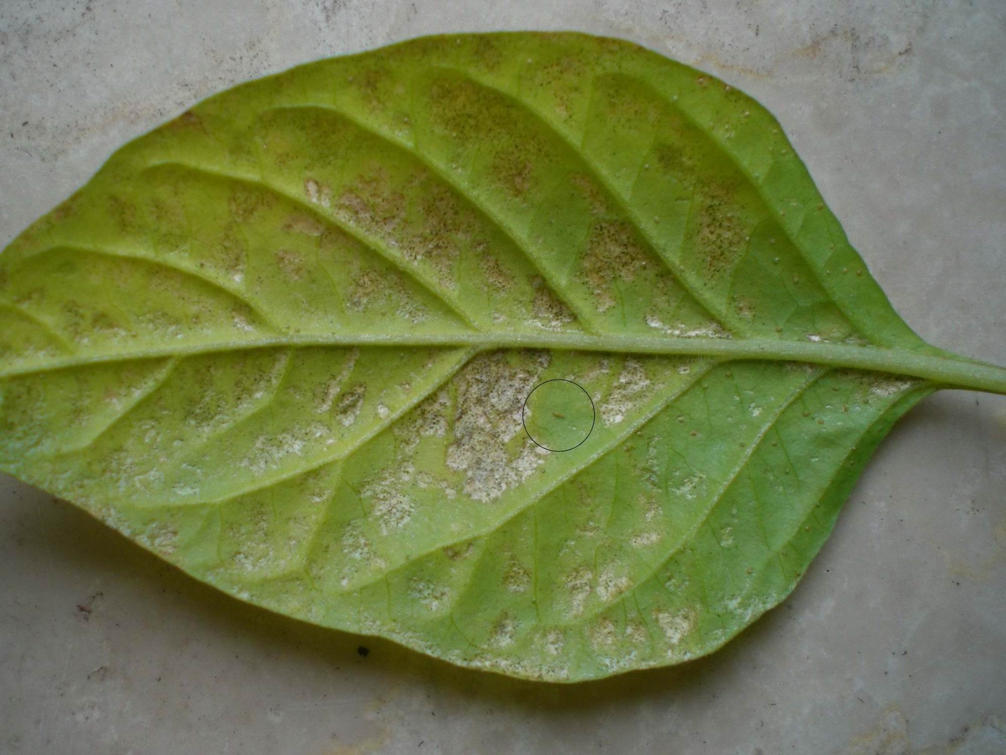Ich habe ein Foto einer Blattunterseite gemacht, bei dem das einigermaßen gut zu erkennen ist. Mit dem Kreis ist so ein Krabbeltier markiert. Die Größe beträgt maximal einen Millimeter. Außerdem sind noch charakteristische Erhebungen auf der Blattunterseite erkennbar (Eier?).