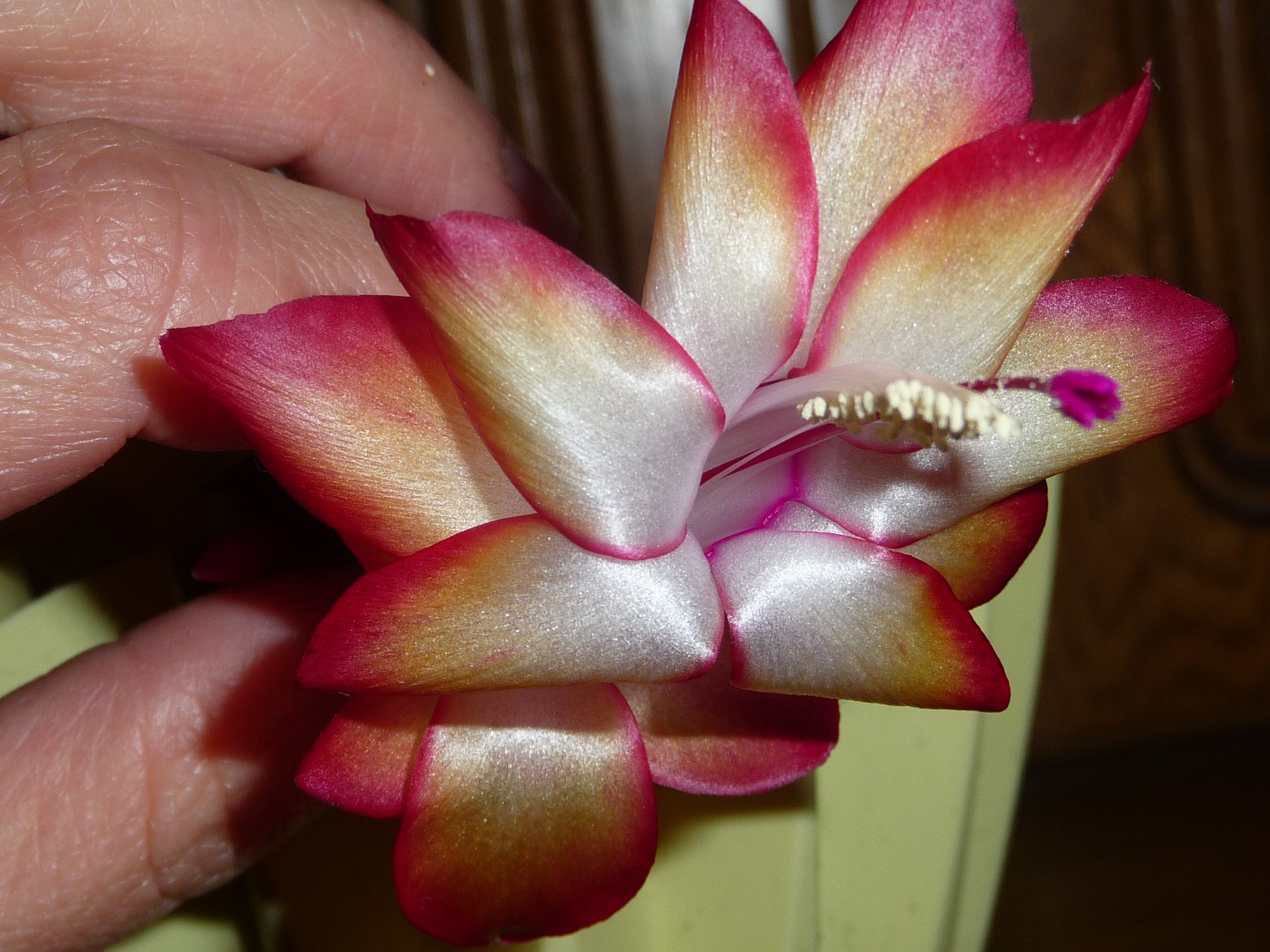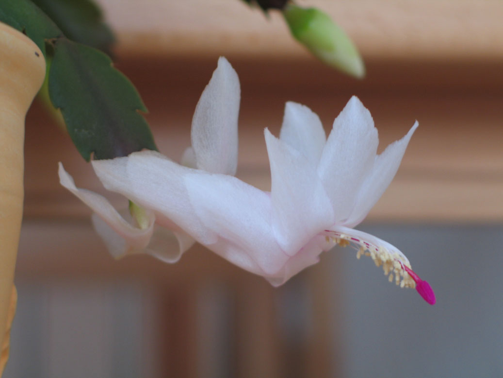 Egal, ich bin grad sowieso etwas traurig, ich hatte meinen einen Schlumbi ganz rot in Erinnerung. Und nun hat der zwar einen ganz breiten roten Rand, aber innen ist die Blüte weiß, genau wie bei meinem zweiten. Bei dem ist der rote Rand noch etwas schmaler, aber da wußte ich das der nicht nur rot hat. Außerdem habe ich noch einen tollen reinweißen geschenkt bekommen, da blüht seit heute die erste Blüte Toll sieht die aus, obwohl ich ja lieber noch 'nen gelben oder orangefarbenen hätte haben wollen....