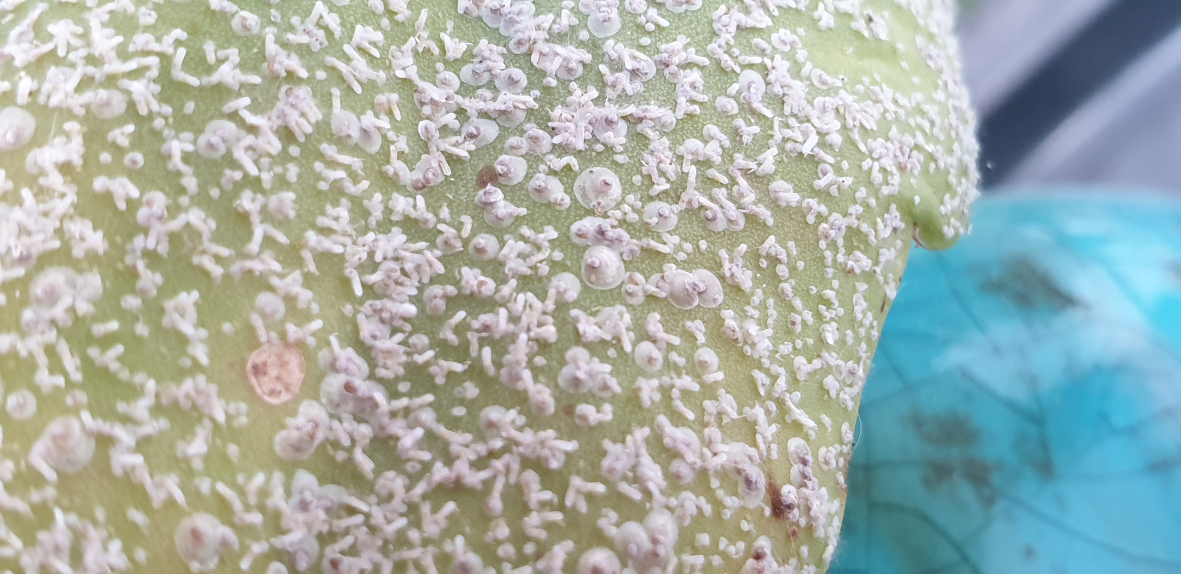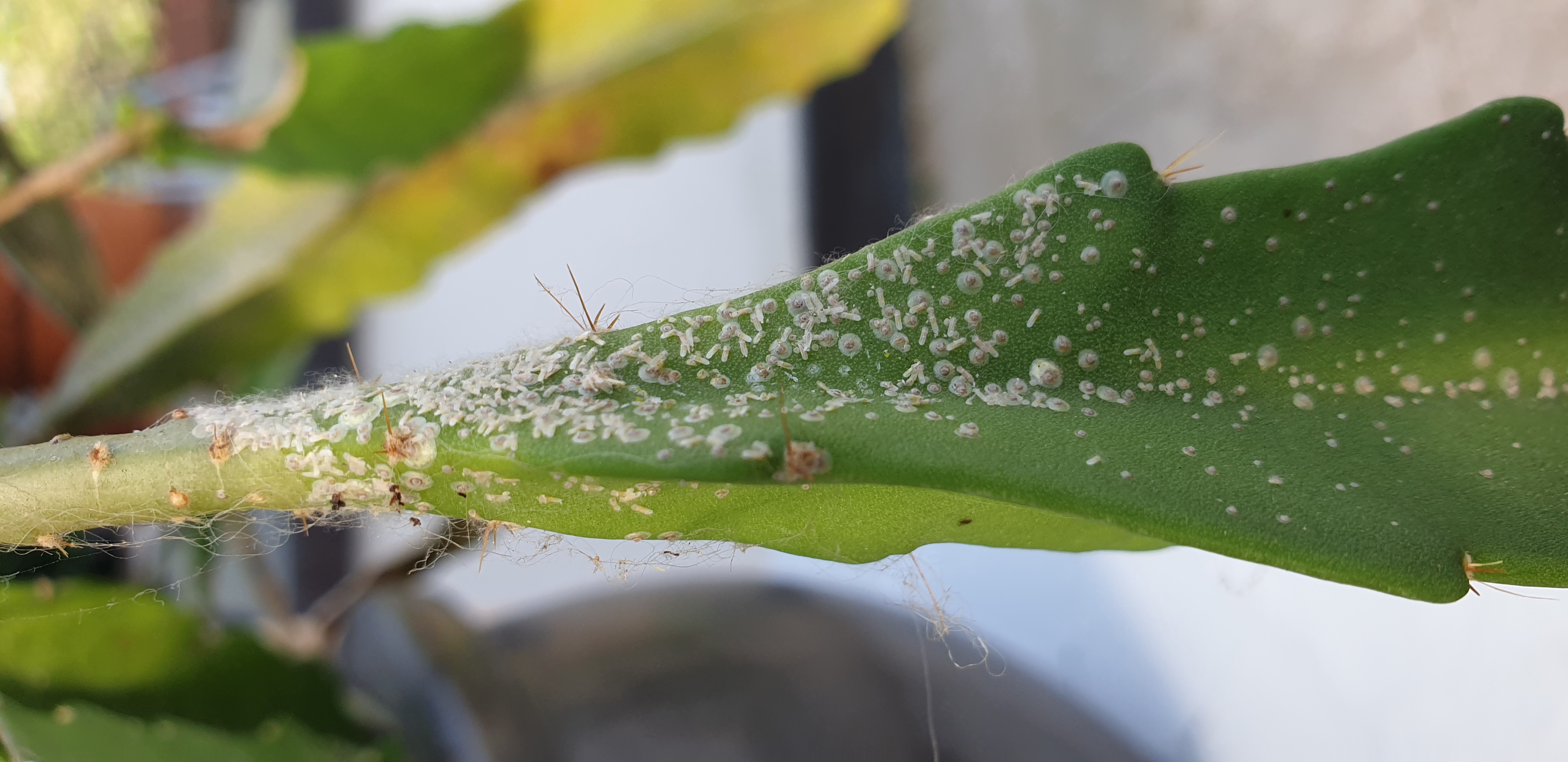 ich habe einen schönen Blattkaktus, der einen komischen weißen Belag/Befall bekommen hat. Siehe Bilder.