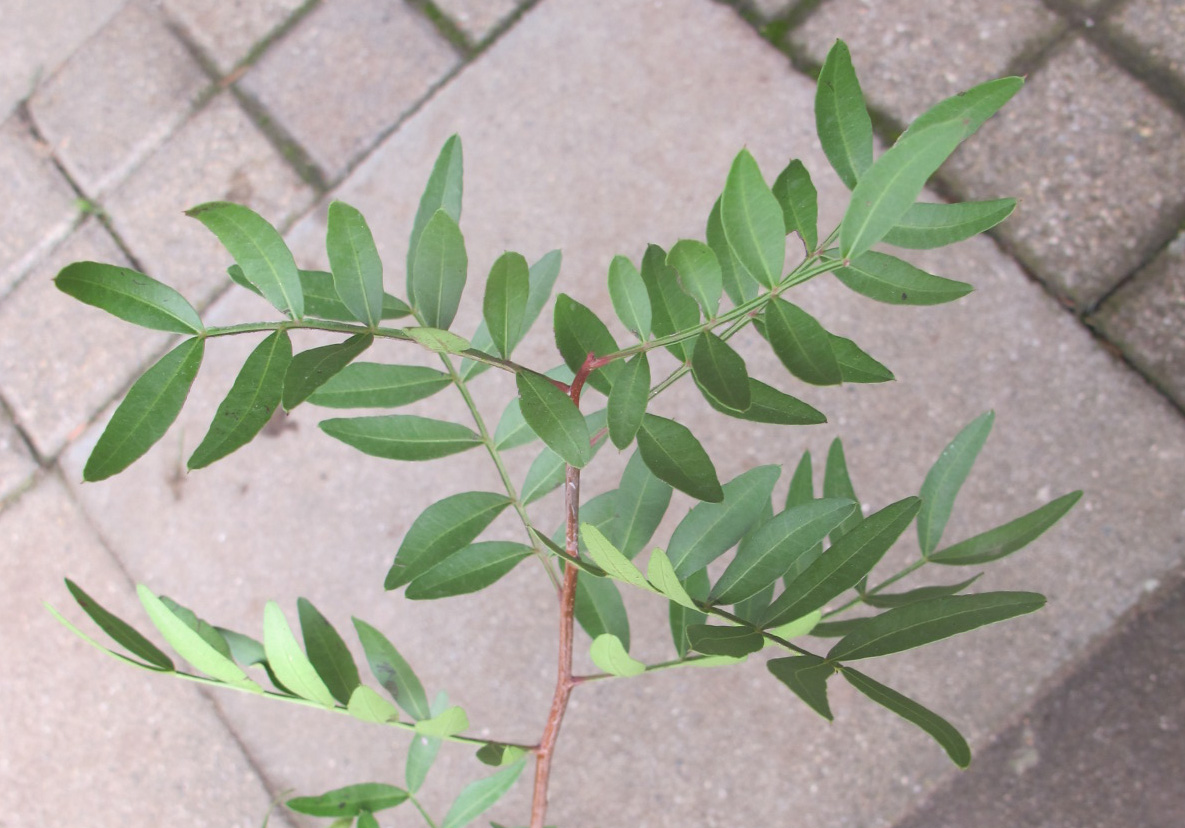 In einem großen Blumenstrauß mit weißen Rosen und weißem Schleierkraut von Dehner befanden sich als Blattschmuck Zweige mit paarig gefiederten Blättern und solche mit wechselständigen ledrigen und oberseits glänzenden Blättern. Die Stengel von der zuerst genannten Blattart zeigen einen schmalen Flügelrand. Das könnte für Wilde Pistazie sprechen. Beim Blattschmuck Nr. 2 dachte ich zunächst an Lorbeer. Dagegen spricht jedoch die feine Zähnelung der Blattränder. Hat jemand vielleicht noch eine andere Idee?