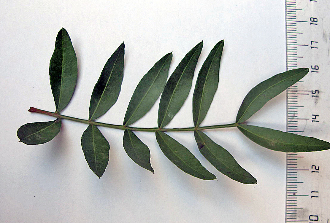 In einem großen Blumenstrauß mit weißen Rosen und weißem Schleierkraut von Dehner befanden sich als Blattschmuck Zweige mit paarig gefiederten Blättern und solche mit wechselständigen ledrigen und oberseits glänzenden Blättern. Die Stengel von der zuerst genannten Blattart zeigen einen schmalen Flügelrand. Das könnte für Wilde Pistazie sprechen. Beim Blattschmuck Nr. 2 dachte ich zunächst an Lorbeer. Dagegen spricht jedoch die feine Zähnelung der Blattränder. Hat jemand vielleicht noch eine andere Idee?