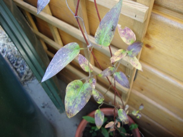 -Clematis: Verfärbungen nur im unteren Bereich, weiter oben sind alle Blätter schön grün. Stehen halbsonnig, werden täglich gegoßen, gedüngt alle 2 Wochen mit Hakaphos