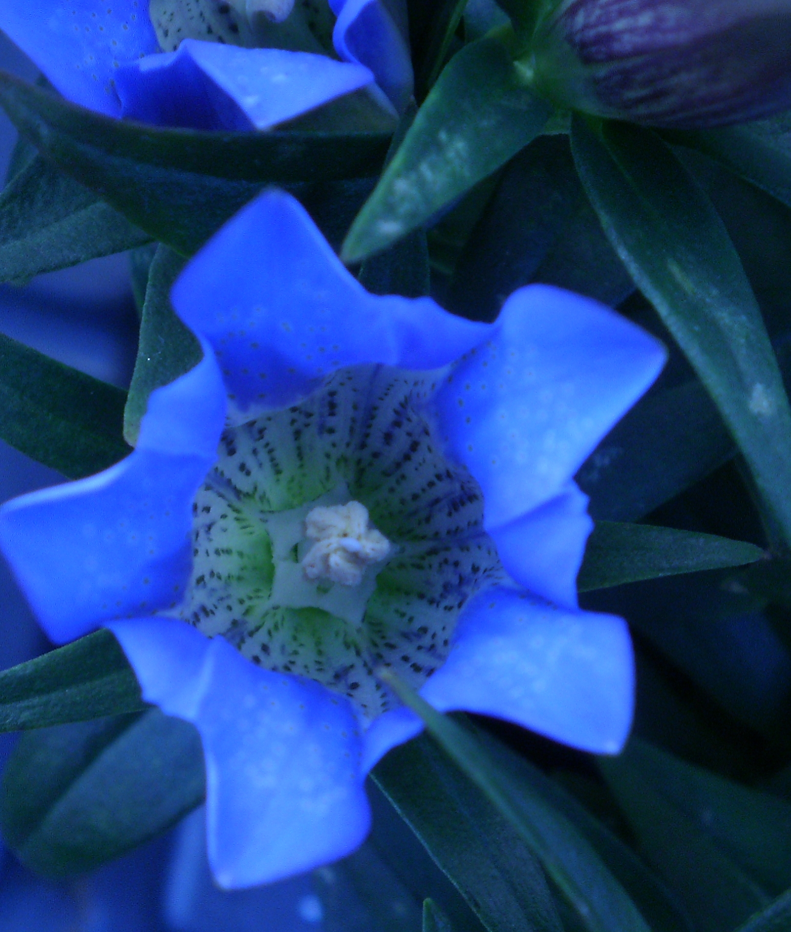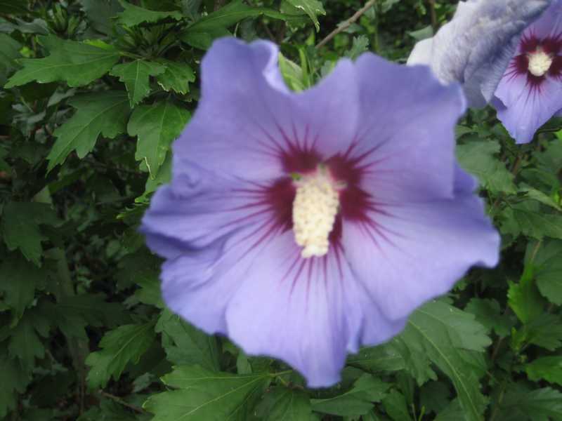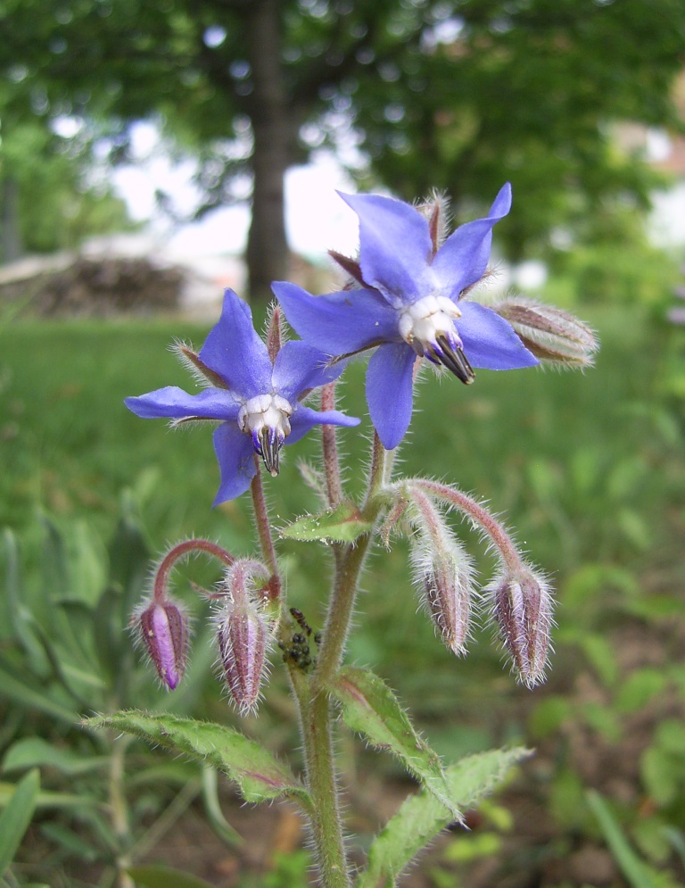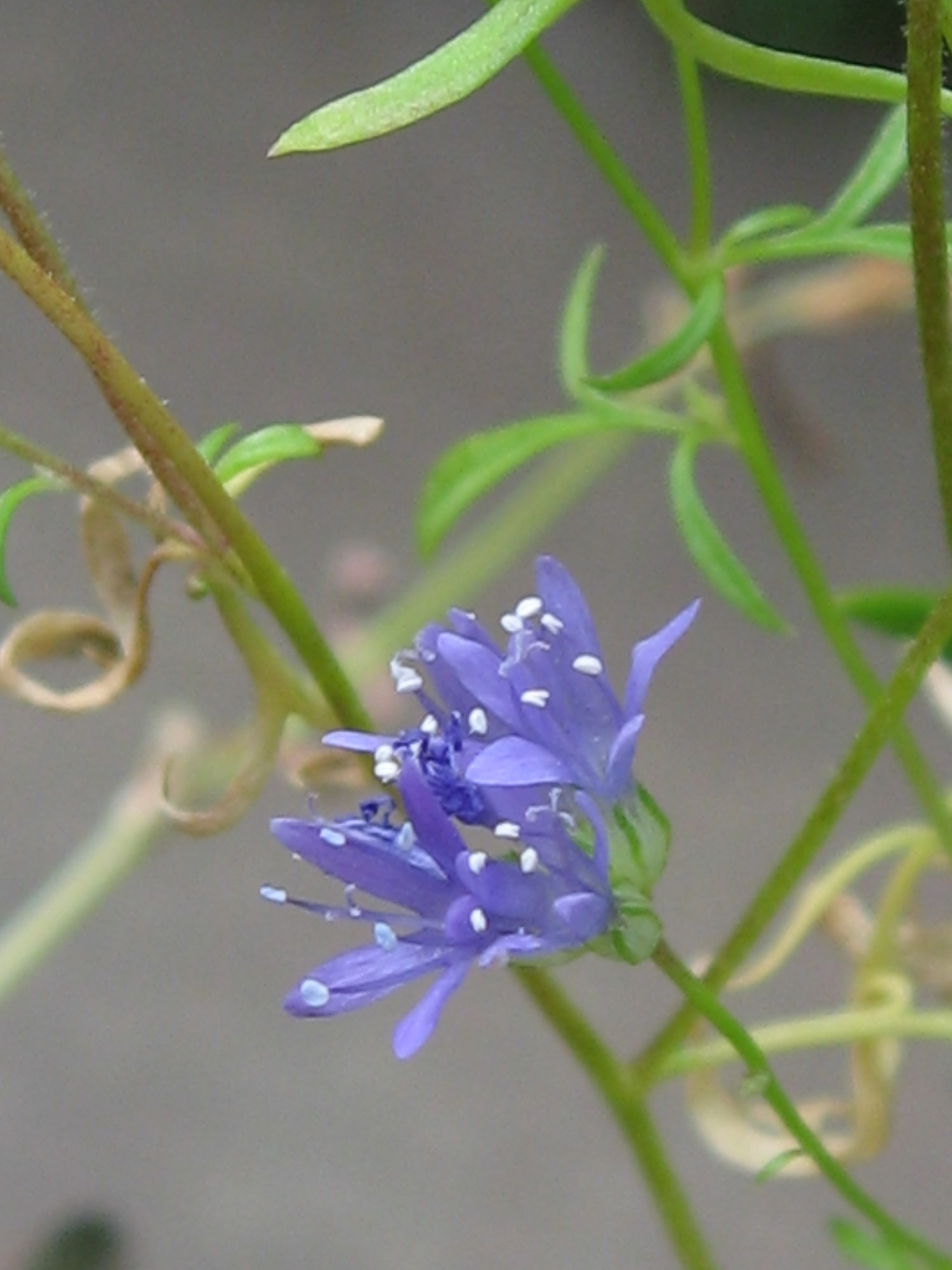 Das balueste was bei mir momentan blüht, ist der Kaschmier- Rittersporn (Delphinium cashmeriense) im Tonscherbengarten. Der bleibt ganz niedrig und braucht darum auch keine Stütze, leidert aber sehr unter starker Hitze, wenn man ihn in die volle Sonne platziert.